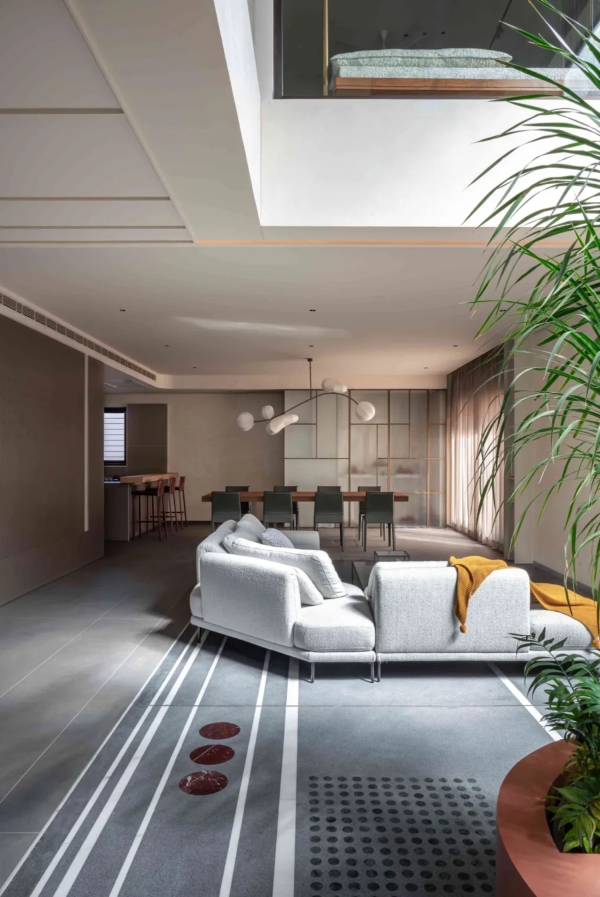 Bên trong, các không gian liên thông nhau, bố trí xung quanh khoảng thông tầng giữa nhà. Tại đây, ánh sáng tự nhiên và gió trời đi xuyên suốt các phòng nhờ những mảng kính lớn và cửa mở đa hướng.