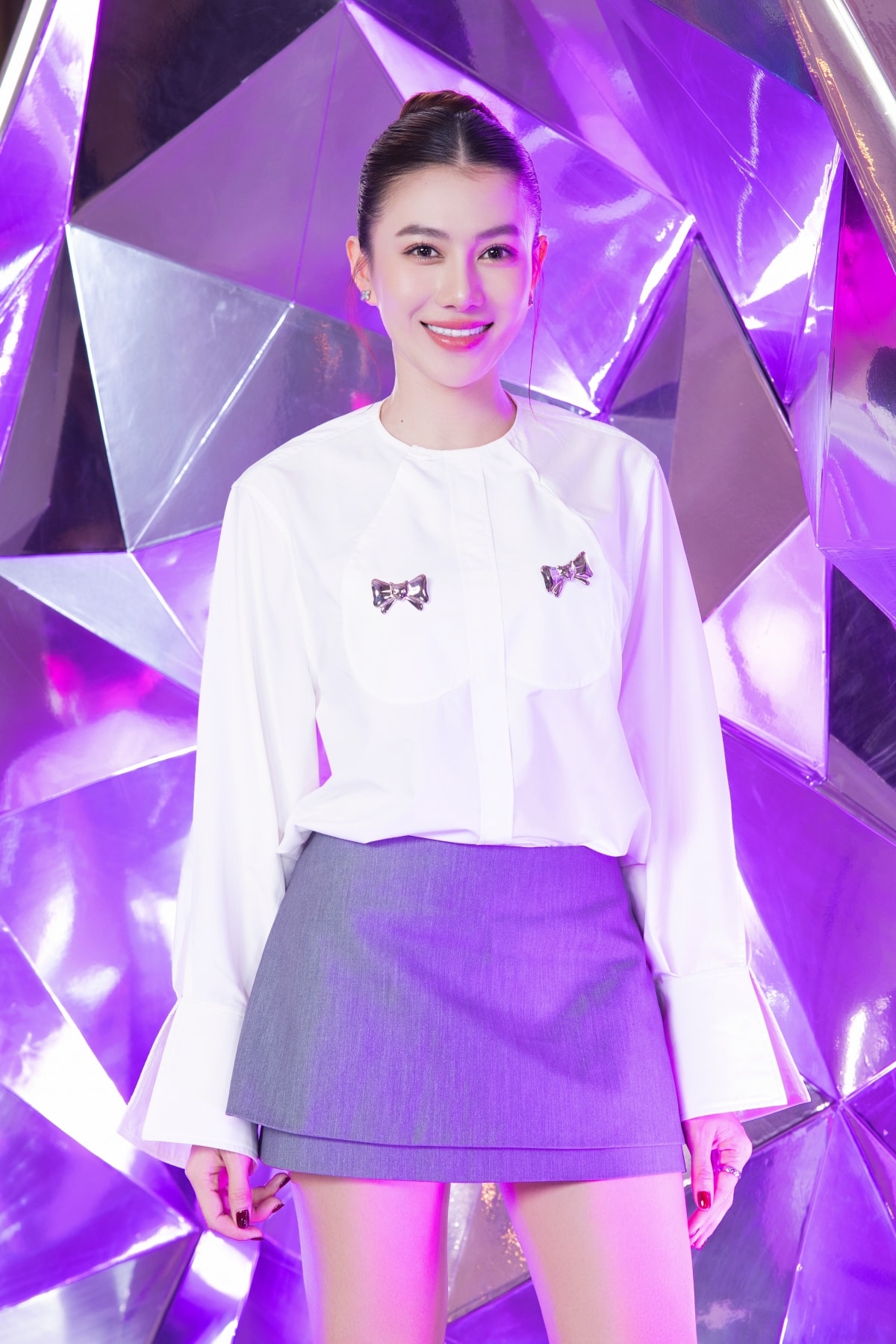 Người mẫu Hà Lê kết hợp sơ mi với chân váy chữ A.