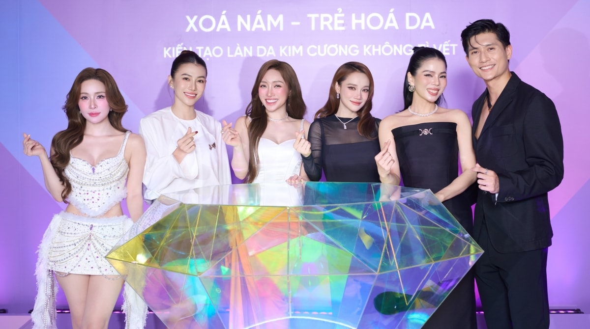 Dàn sao chụp ảnh lưu niệm ở sự kiện. Từ trái sang: Quỳnh Nga, Lê Hà, CEO Lý Thùy Chang, Nhã Phương và Lệ Quyên - Lâm Bảo Châu.