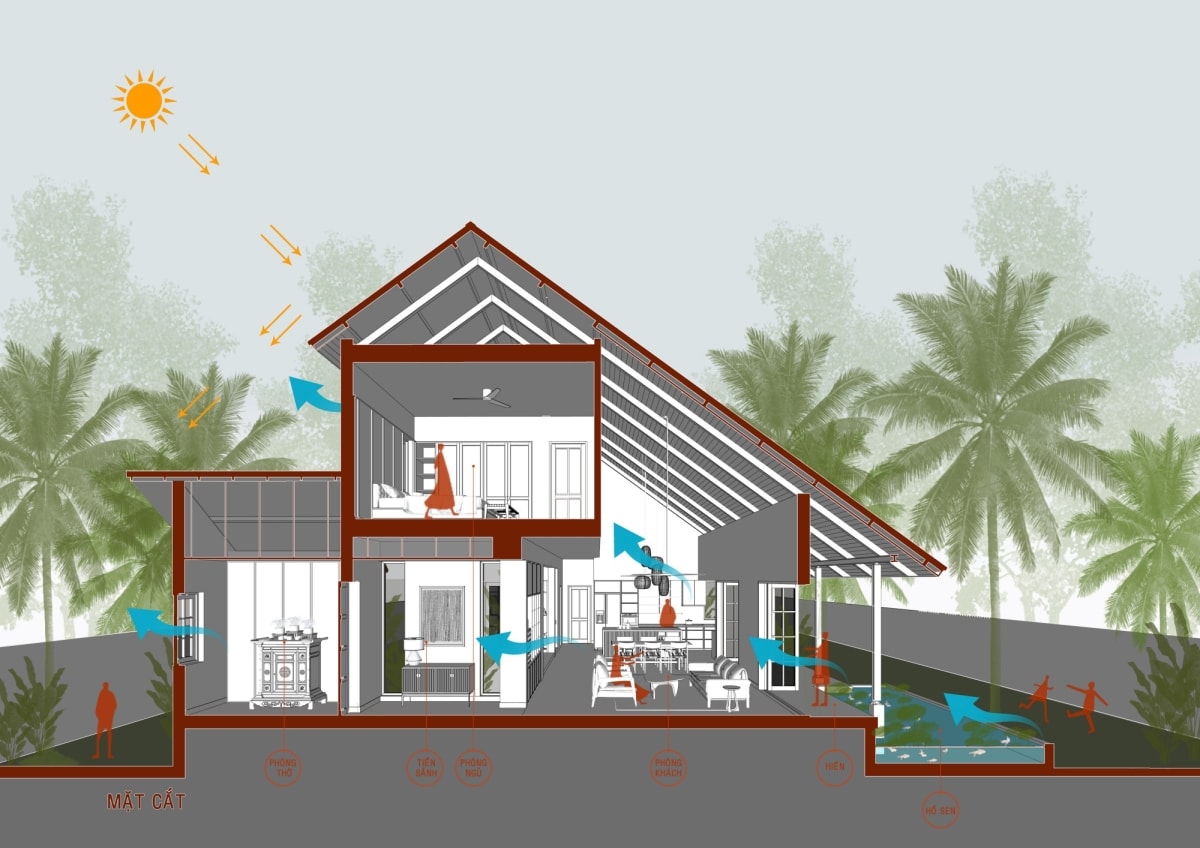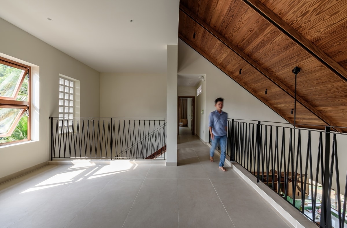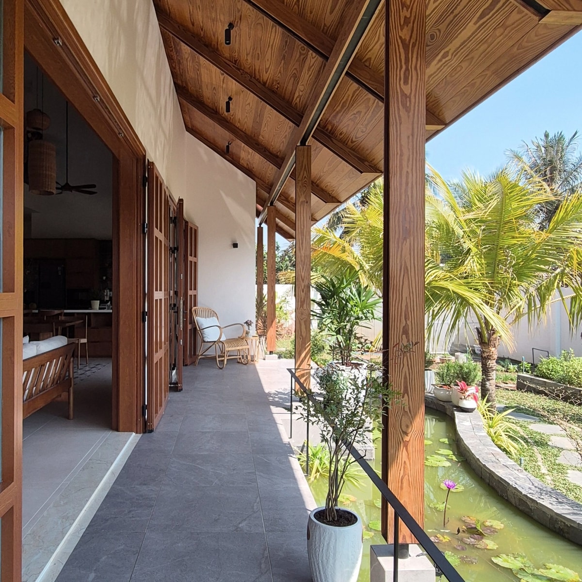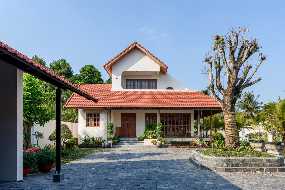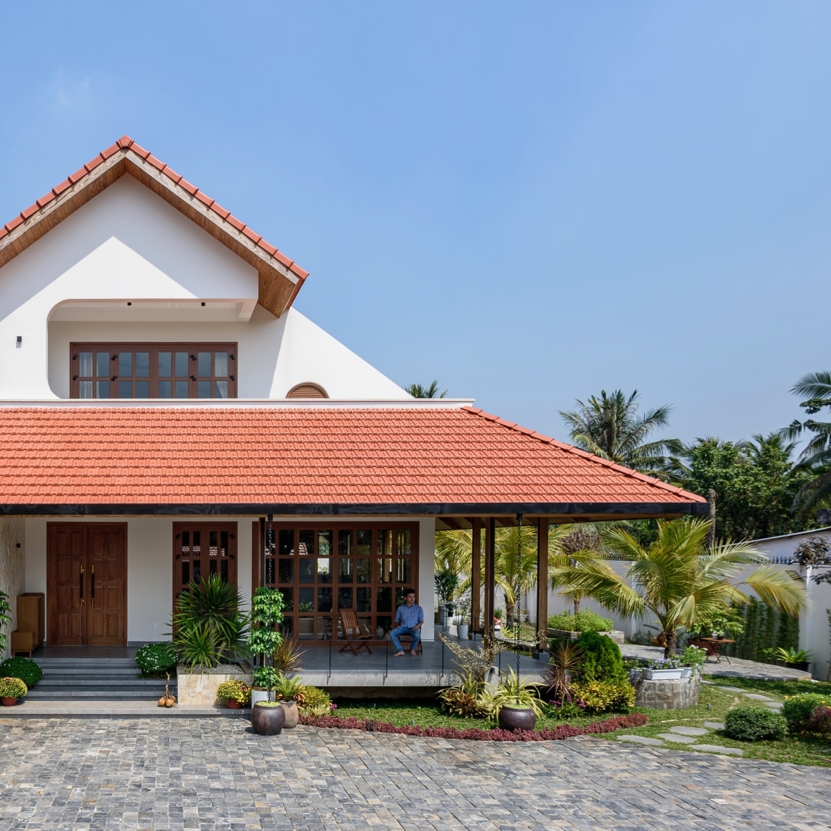 Công trình tái hiện tinh thần nhà truyền thống miền Tây qua hệ mái ngói trải dài, hàng hiên rộng chạy dọc mặt tiền.