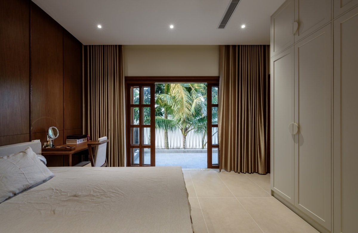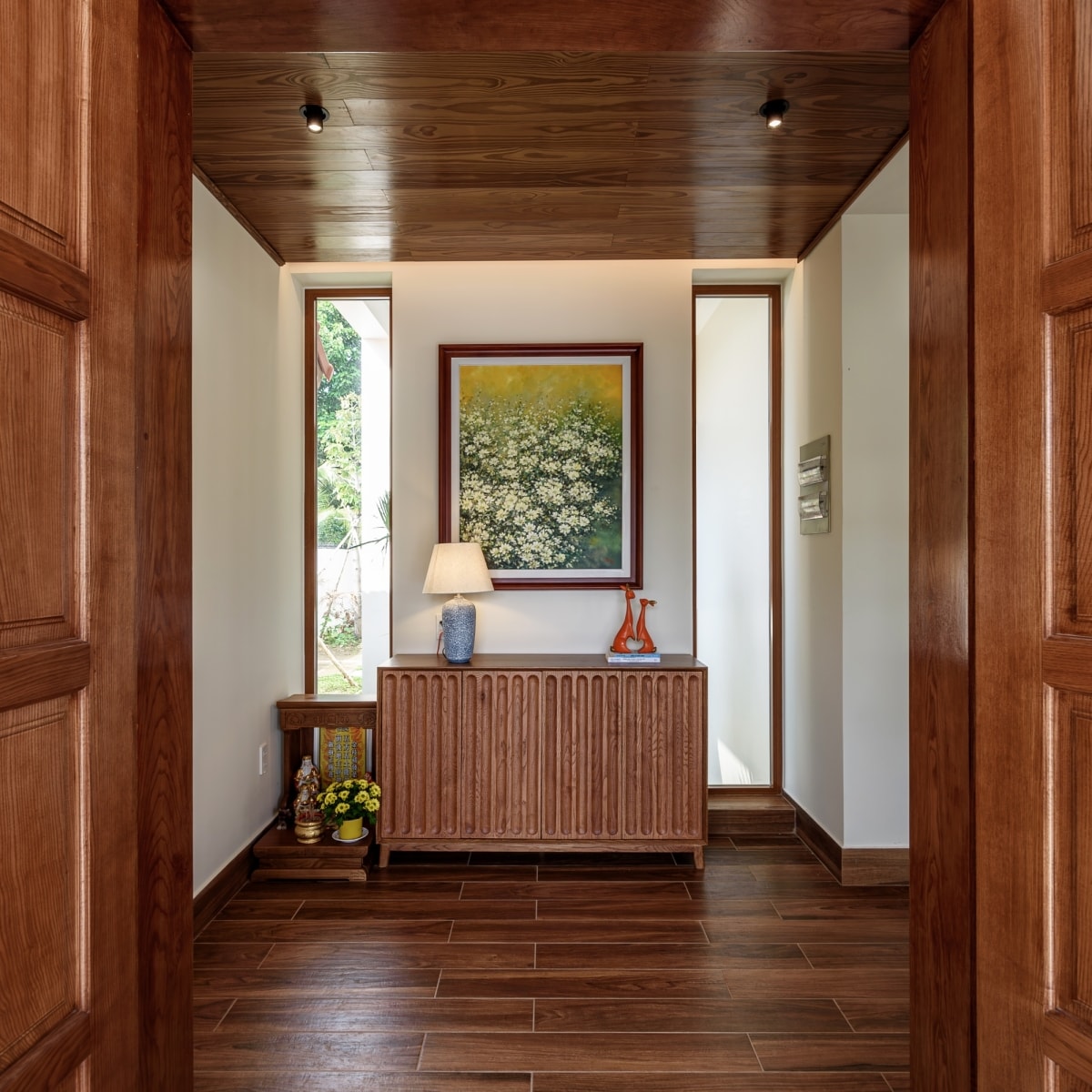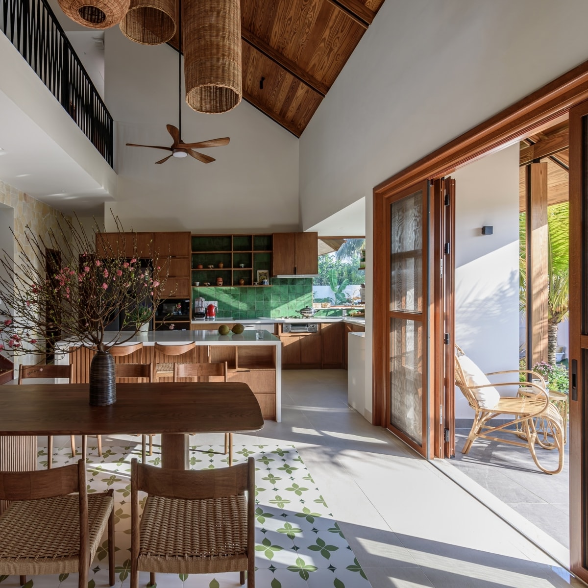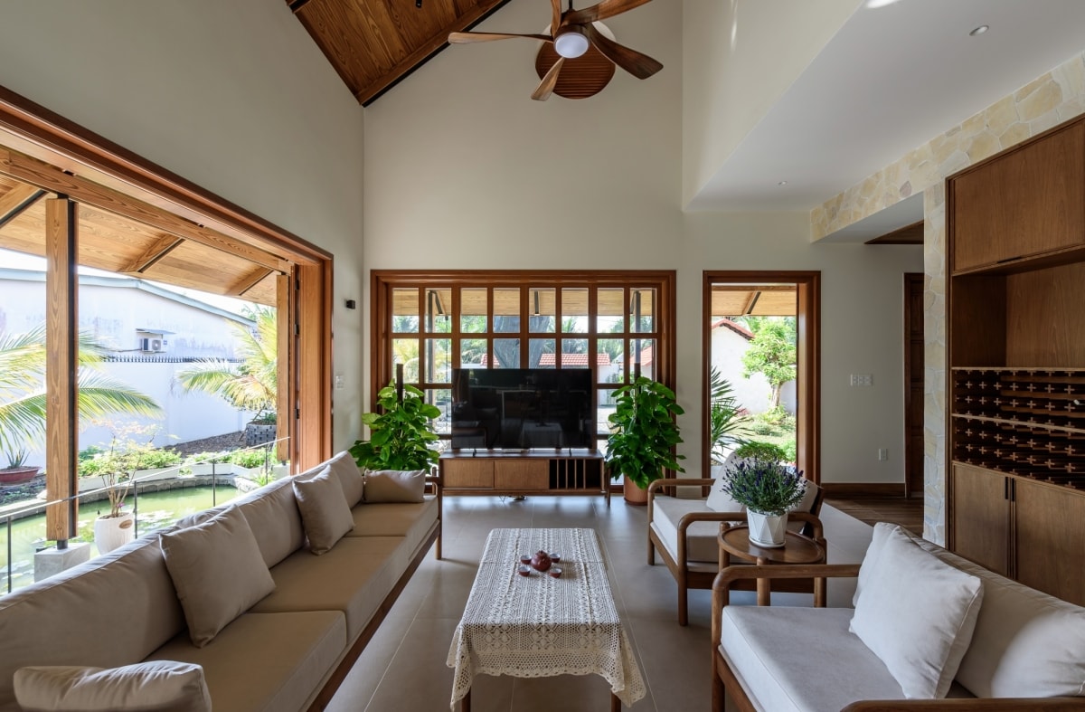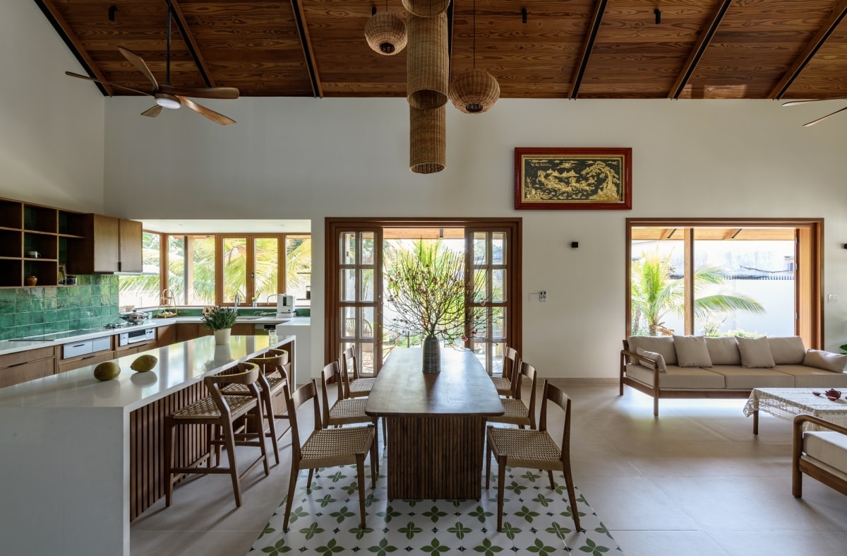 Công trình tái hiện tinh thần nhà truyền thống miền Tây qua hệ mái ngói trải dài, hàng hiên rộng chạy dọc mặt tiền.
