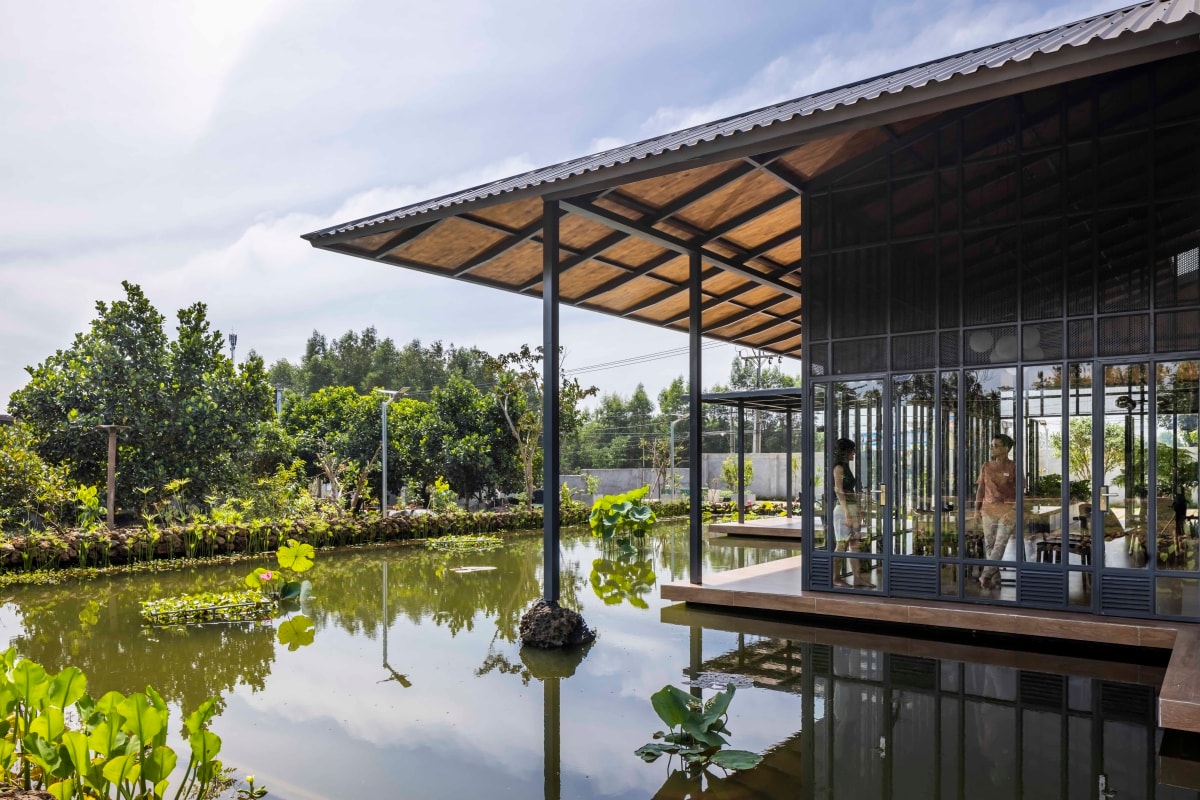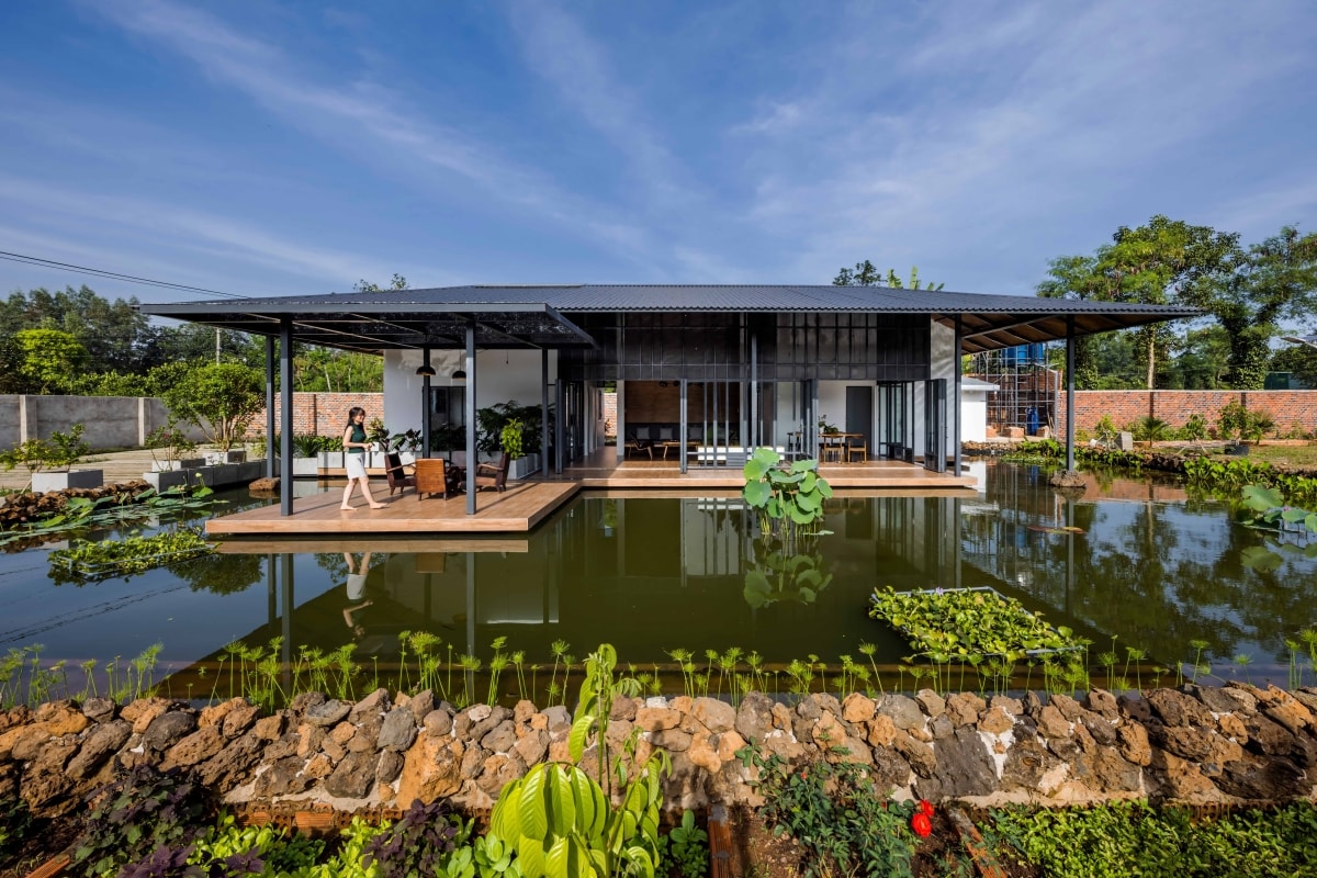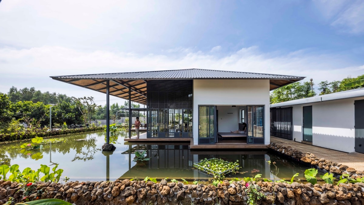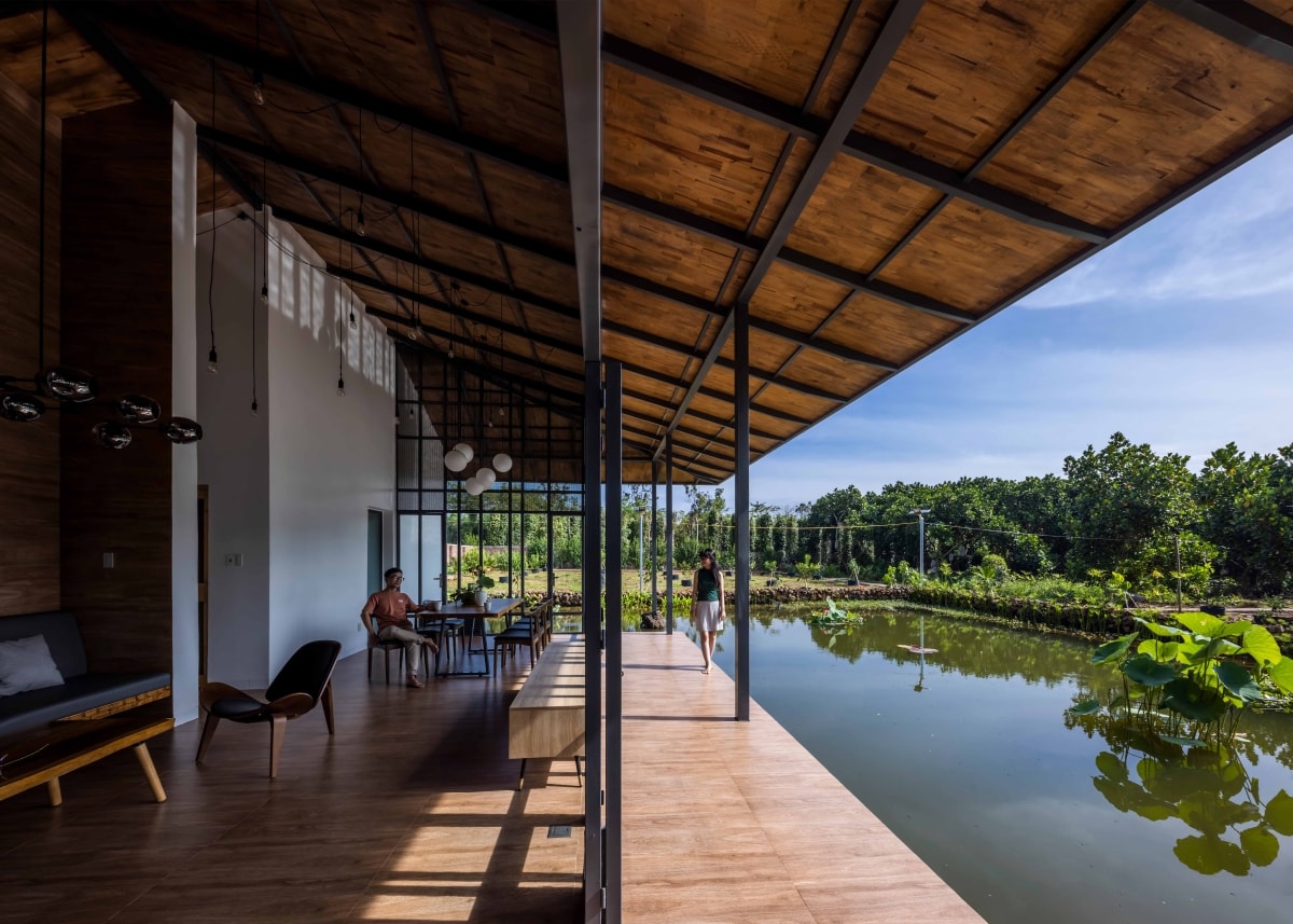 Công trình 116 m2 trên khu đất vườn cây ăn trái tổ chức không gian chung hướng ra hồ nước, nơi vừa phục vụ nông nghiệp vừa trồng rau thủy sinh và nuôi cá.