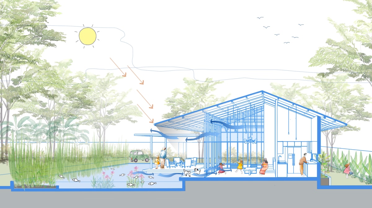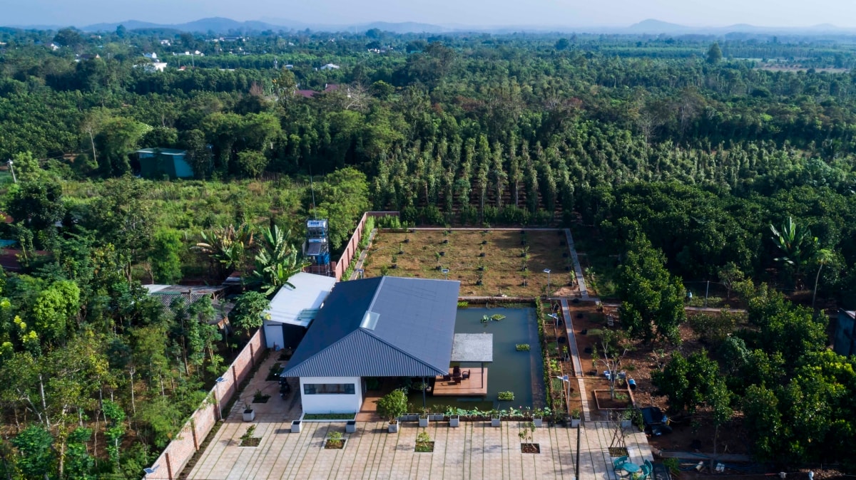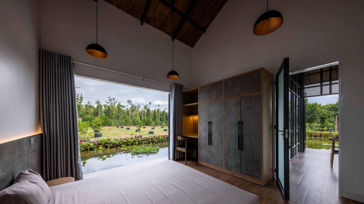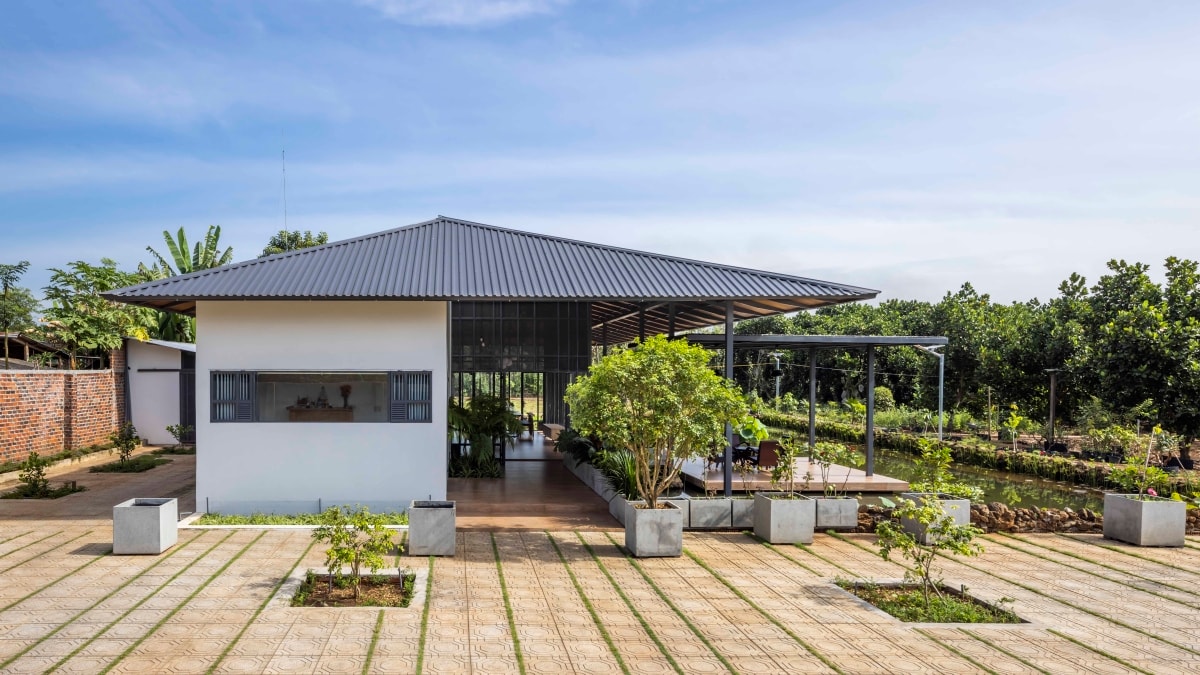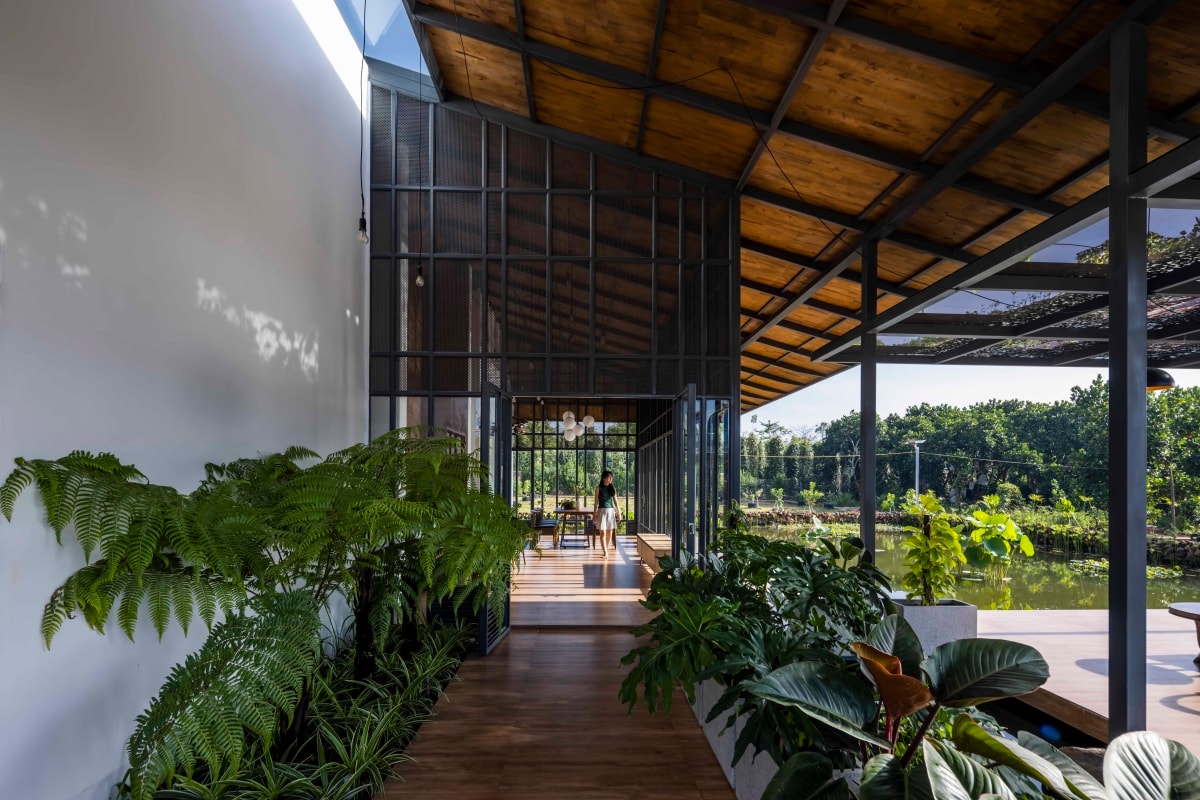 Công trình 116 m2 trên khu đất vườn cây ăn trái tổ chức không gian chung hướng ra hồ nước, nơi vừa phục vụ nông nghiệp vừa trồng rau thủy sinh và nuôi cá.