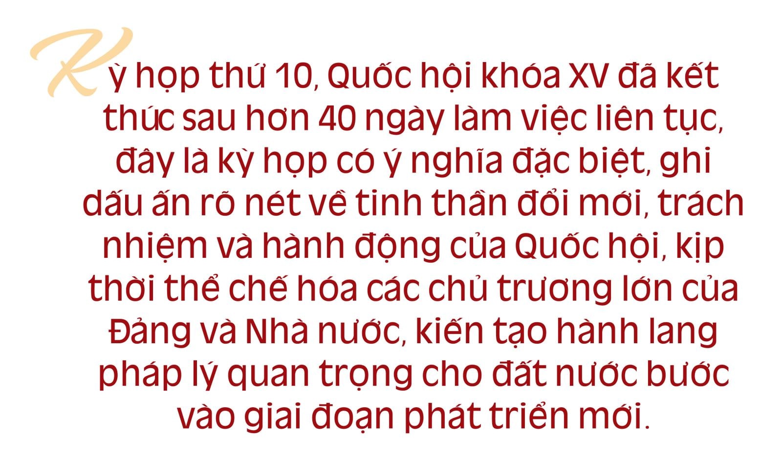 Kỳ họp thứ 10, Quốc hội khóa XV đã kết thúc sau hơn 40 ngày làm việc liên tục, đây là kỳ họp có ý nghĩa đặc biệt, ghi dấu ấn rõ nét về tinh thần đổi mới, trách nhiệm và hành động của Quốc hội, kịp thời thể chế hóa các chủ trương lớn của Đảng và Nhà nước, kiến tạo hành lang pháp lý quan trọng cho đất nước bước vào giai đoạn phát triển mới.