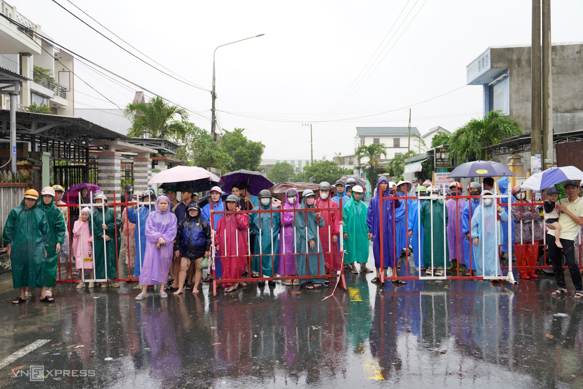 Nhiều người thân đứng chờ người nhà được đưa ra khỏi khu vực ngập lũ ở phường Điện Bàn Đông.