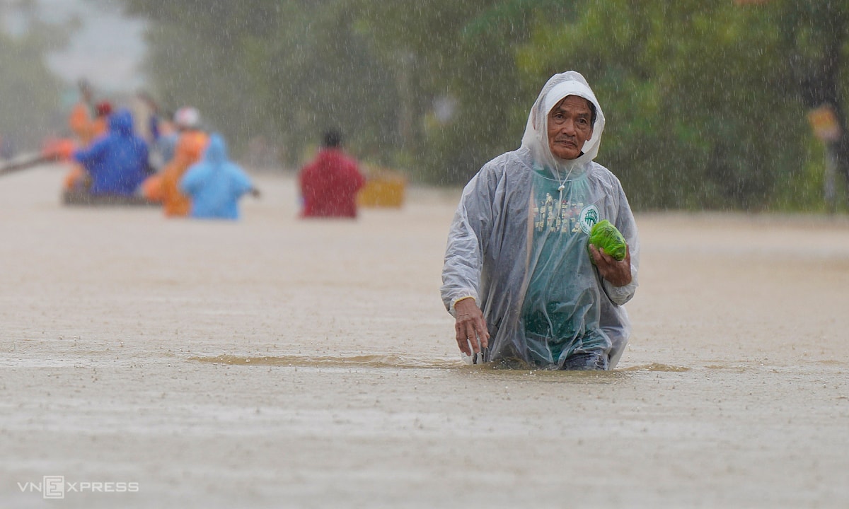 Ngay đầu tuyến DH8 giao đường Trần Thủ Độ, nước ngập gần một mét, người dân phường Điện Bàn Đông phải dùng thuyền đi lại, trong đó nhiều người chọn cách lội bộ để ra khu vực bên ngoài lánh tạm hoặc mua lương thực, thực phẩm.