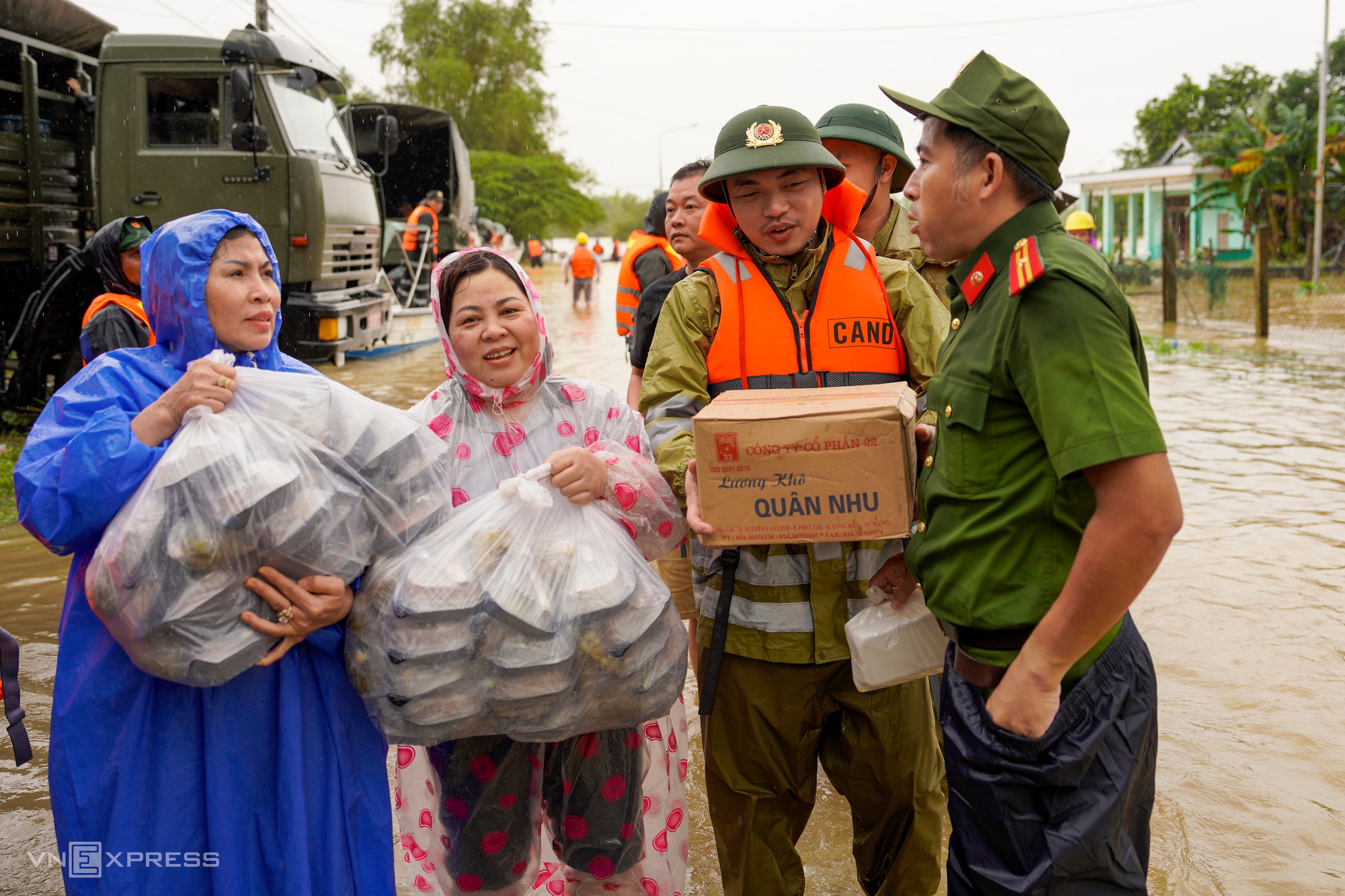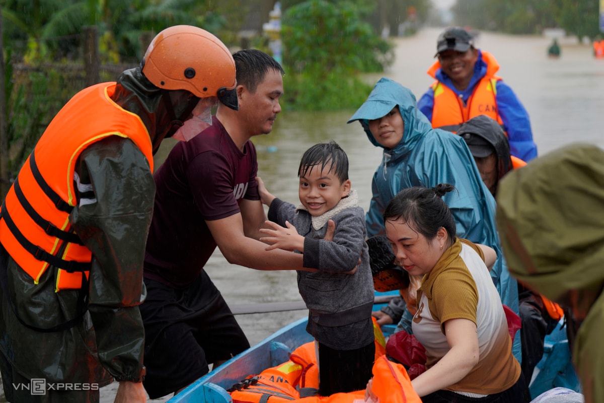 Người già, trẻ nhỏ được ưu tiên đưa ra khỏi vùng ngập sâu. Mọi người dân khi sơ tán phải mặc áo phao, đến nơi an toàn mới được cởi.
