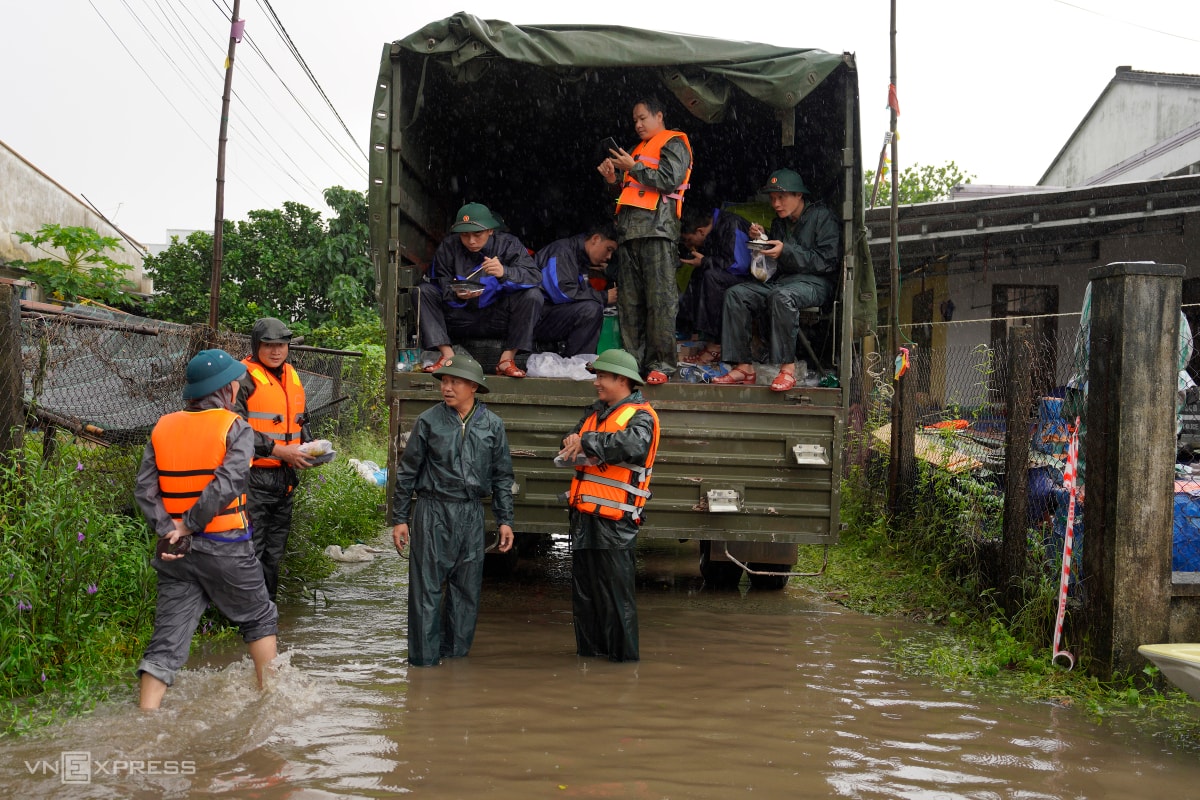 Các chiến sĩ Quân khu 5 tranh thủ giờ trưa dùng cơm dã chiến ngay trên xe để kịp cứu trợ và sơ tán người dân trong buổi chiều.