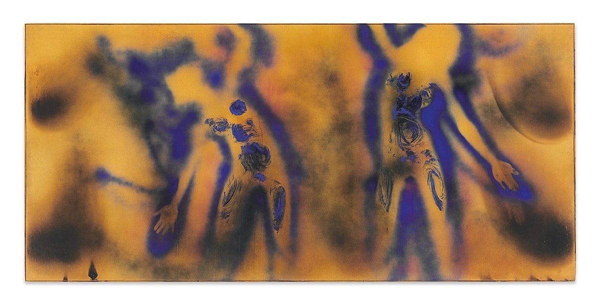 Sinh thời, Yves Klein có nhiều buổi triển lãm, trình diễn táo bạo. Một trong số đó là dùng cơ thể người làm "cọ sống" trong loạt tranh Nhân trắc học (Anthropometries) giai đoạn 1960-1962. Ông chỉ đạo người mẫu tự bôi sơn lên thân trước, sau đó áp người lên giấy. Fire Color (Màu lửa, FC1) là bức đắt nhất thuộc đề tài này, được Christie's bán với giá 36,4 triệu USD tháng 5/2012. Ảnh: Christie's