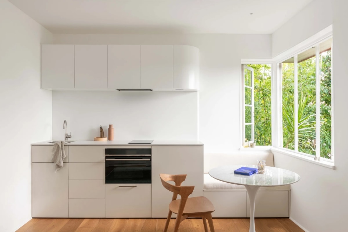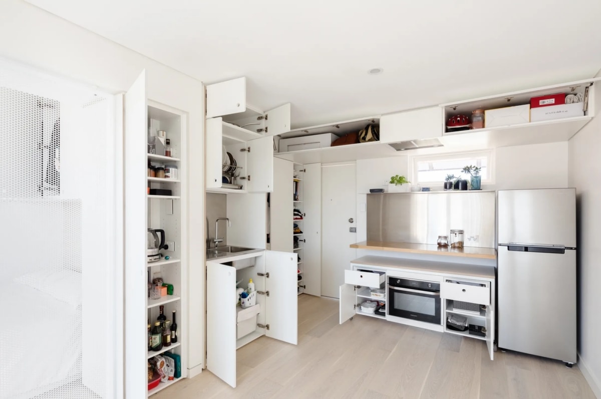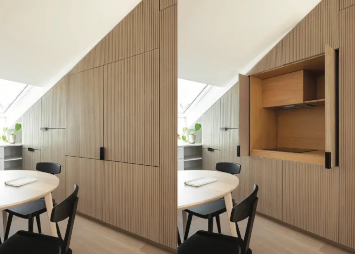 Bếp trong nhà nhỏ có thể đặt ở hành lang, giấu trong tủ nội thất hoặc thiết kế linh hoạt để tối ưu diện tích và công năng.