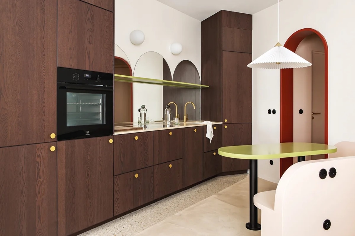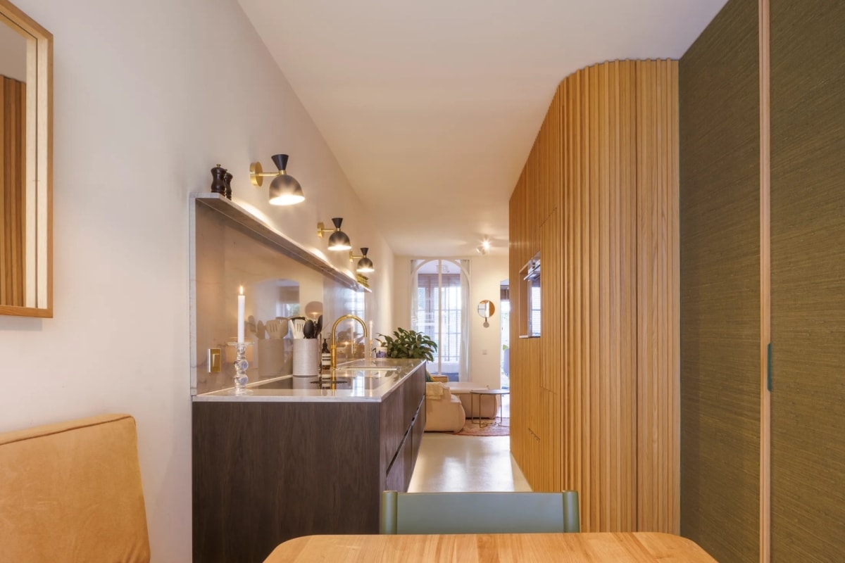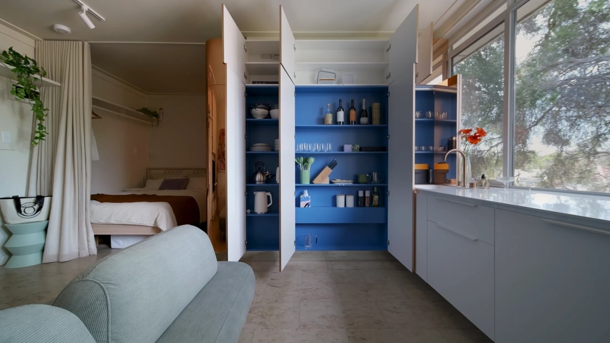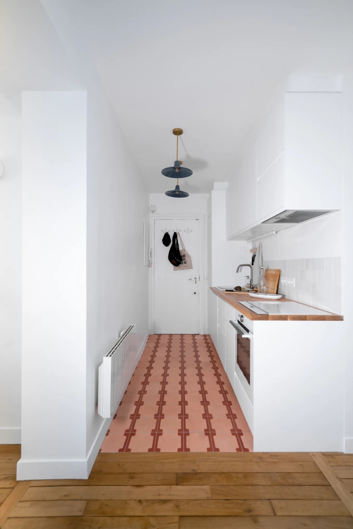 Bếp trong nhà nhỏ có thể đặt ở hành lang, giấu trong tủ nội thất hoặc thiết kế linh hoạt để tối ưu diện tích và công năng.