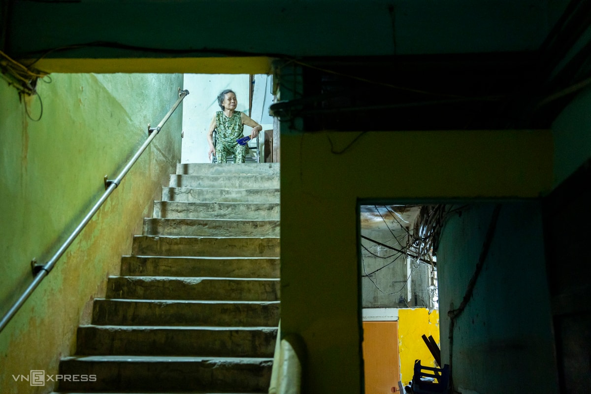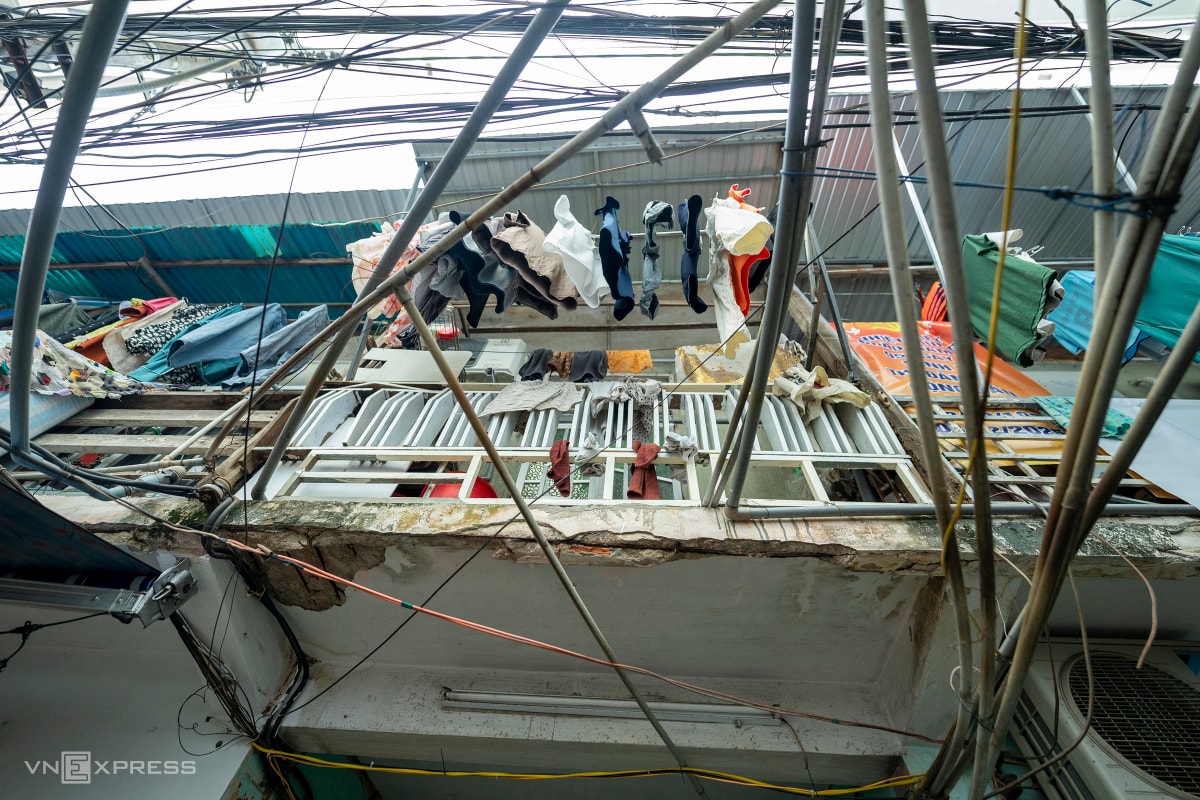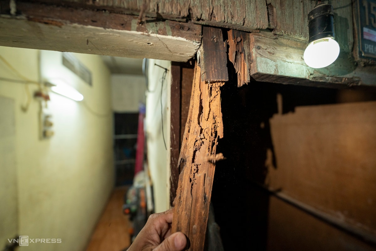 Hầu hết vách ngăn phòng ở tầng hai được làm bằng ván ép, khung gỗ. Sau hơn 60 năm, nhiều thanh gỗ đã mục do mối mọt, chỉ cần chạm nhẹ cũng có thể bong phần gỗ hỏng. Người dân cho biết vào mùa hè, mối bay ra khắp các phòng và lối đi.
