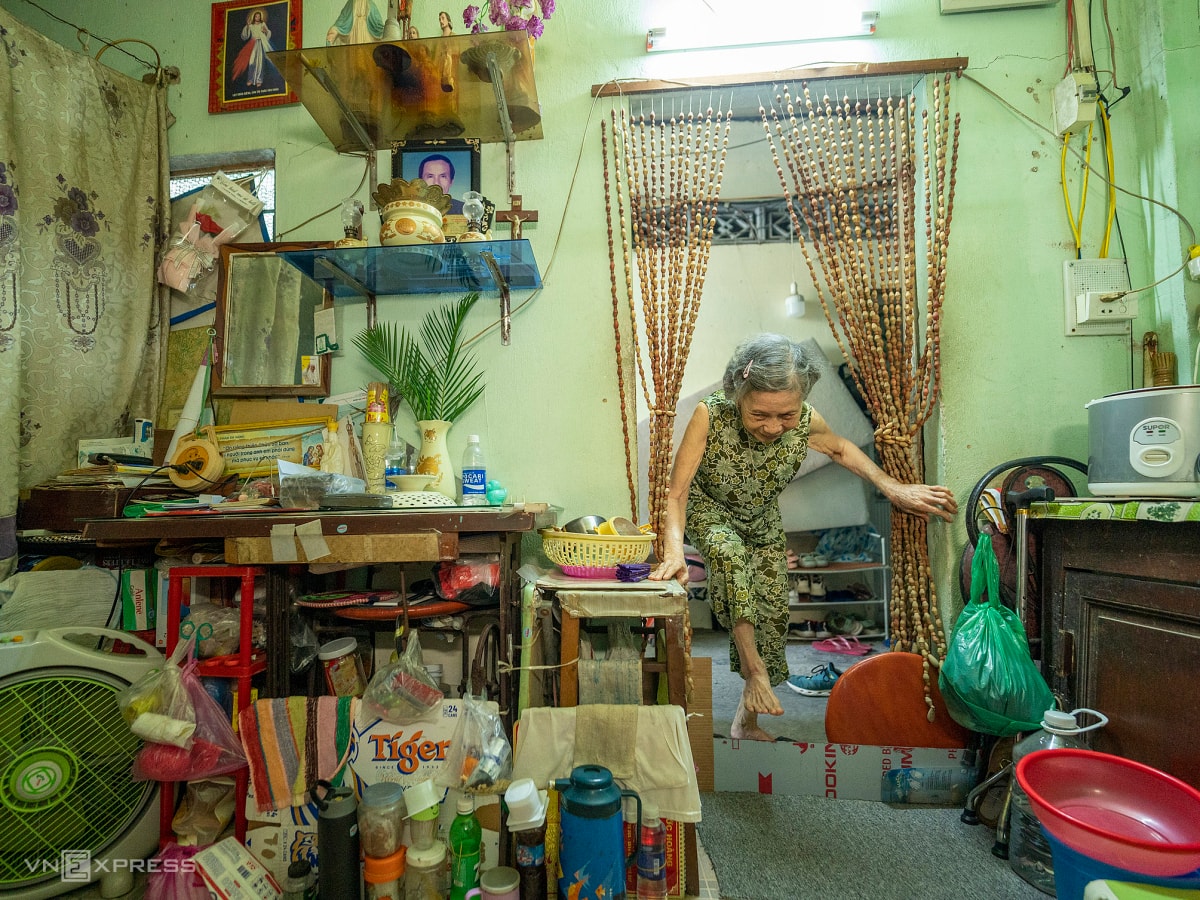 Cụ sống cùng con gái, mẹ con phải chia từng góc nhỏ để đặt các vật dụng sinh hoạt và chăm sóc sức khỏe. Mỗi ngày, cụ ngủ trên chiếc giường nhỏ, còn con gái trải nệm nằm dưới nền nhà.