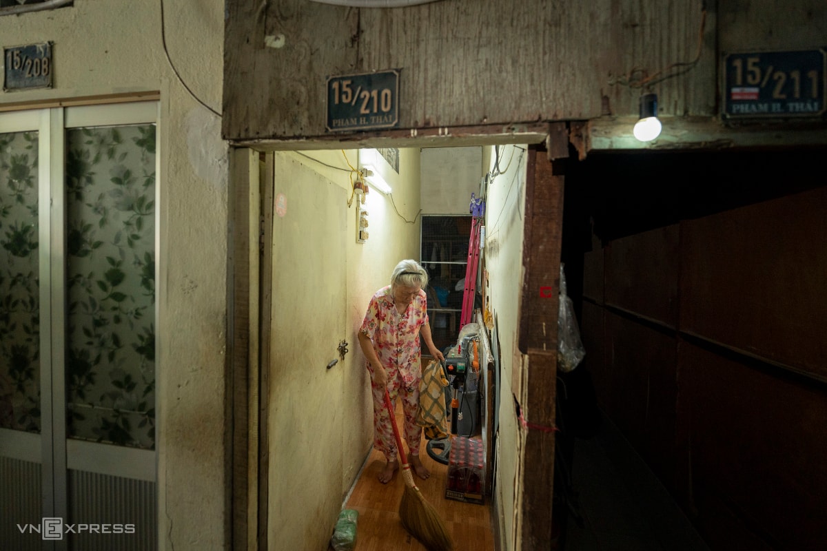 Trong không gian khoảng 3 m2, ba số nhà được gắn trên tường và các tấm ván ép, đánh dấu ba căn riêng biệt. Nhiều lối vào chỉ rộng khoảng một mét. Vách gỗ bị mối mọt khiến cụ Nguyễn Thị Báu, 86 tuổi, phải thường xuyên quét dọn.