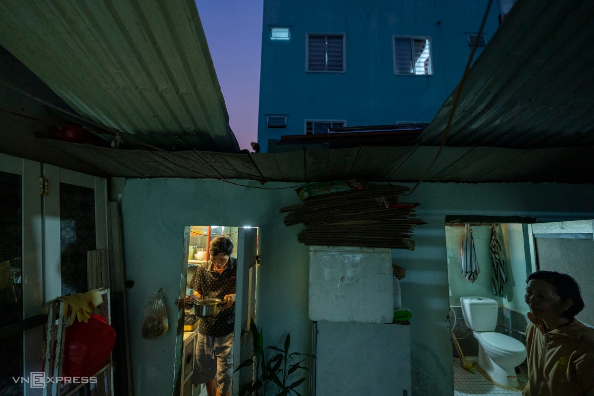 Chiều tối là lúc khu dân cư này đông đúc hơn, khi người lao động về nhà. Họ nấu ăn, tắm giặt trong không gian chật hẹp vài mét vuông. Mái tôn không che chắn hết phía trên, để chừa ô lấy ánh sáng.