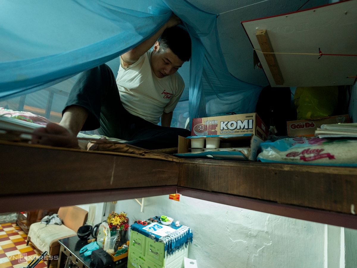 Nguyễn Quốc Hưng, 30 tuổi, phải nghiêng người mới có thể chui vào gác xép được dựng sát trần, cao chưa đầy một mét. Trong căn nhà nhỏ, gia đình anh làm hai gác tạm như vậy để dành phần diện tích bên dưới cho sinh hoạt.