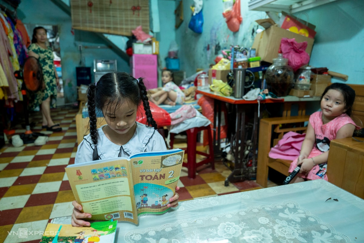 Bé Phương Oanh, học sinh lớp 2 Trường Tiểu học Phù Đổng, tranh thủ học bài ở nơi vừa là phòng khách, vừa đặt máy may, chứa quần áo, chăn nệm và nhiều vật dụng sinh hoạt khác.