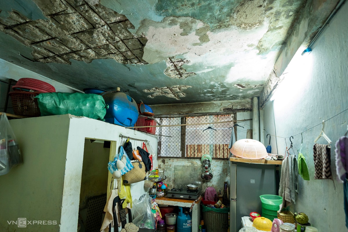 Nhiều căn nhà có trần bêtông bong tróc, lộ cốt thép hoen gỉ. Các căn ở tầng 1 thường trên 30 m2, một số đã được cấp sổ đỏ.