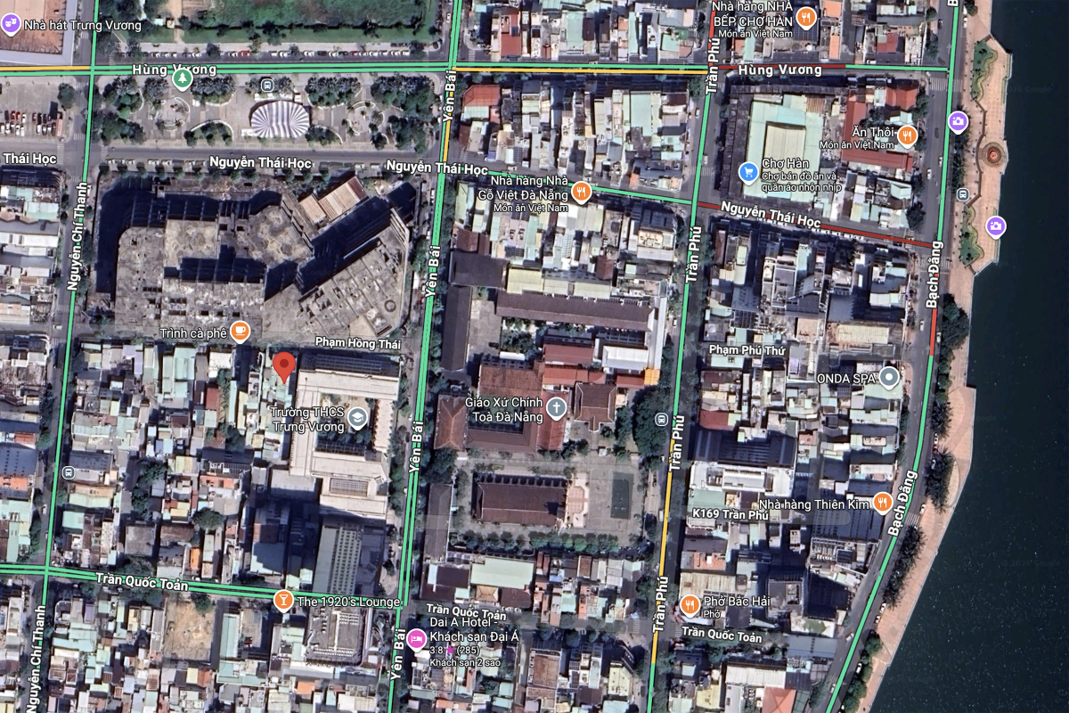 Vị trí khu dân cư kiệt 15 Phạm Hồng Thái (chấm đỏ), sau lưng trường THCS Trưng Vương, gần nhà thờ Chính tòa Đà Nẵng, chợ Hàn, nhà hát Trưng Vương, sông Hàn... Ảnh: Google Maps