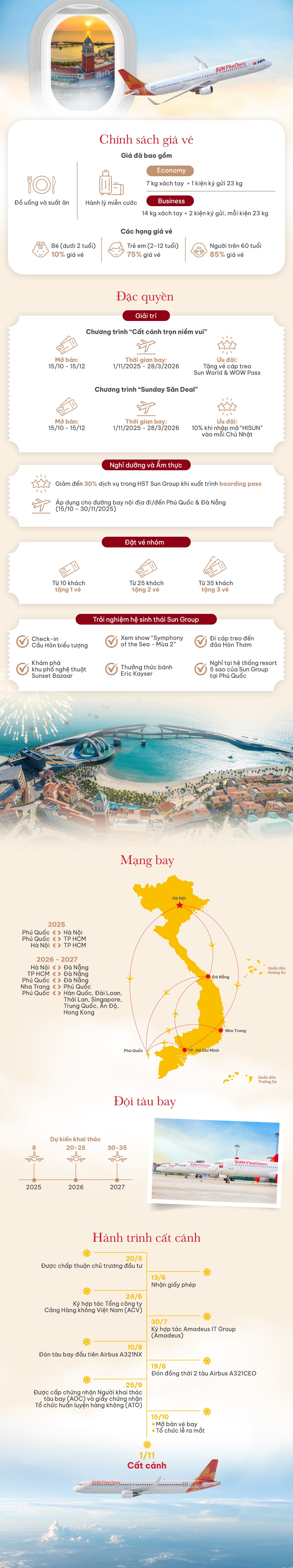 Sun PhuQuoc Airways mở bán vé từ 15/10, khởi hành 1/11, cung cấp nhiều hạng vé cùng ưu đãi giải trí, nghỉ dưỡng trong hệ sinh thái Sun Group.
