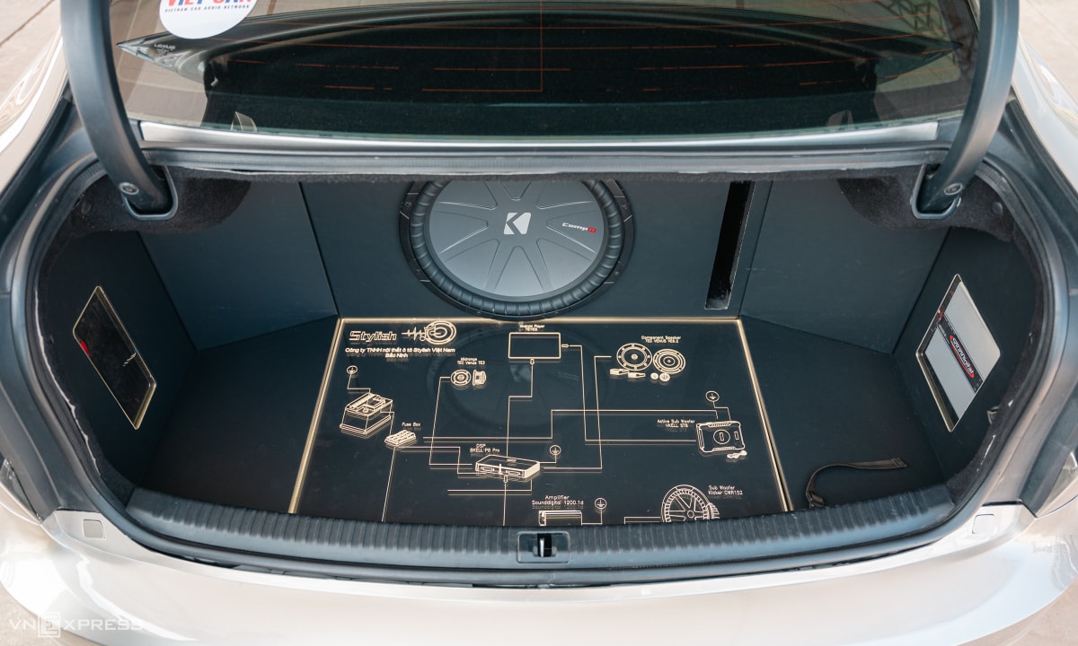 Một xe độ gọn gàng với sơ đồ của hệ thống âm thanh kèm loa trầm đặt phía sau. Loa trầm với âm tần thấp thường đặt ở cốp, xe hướng tới âm thanh công suất lớn nên sơ đồ lắp đặt đơn giản hơn.