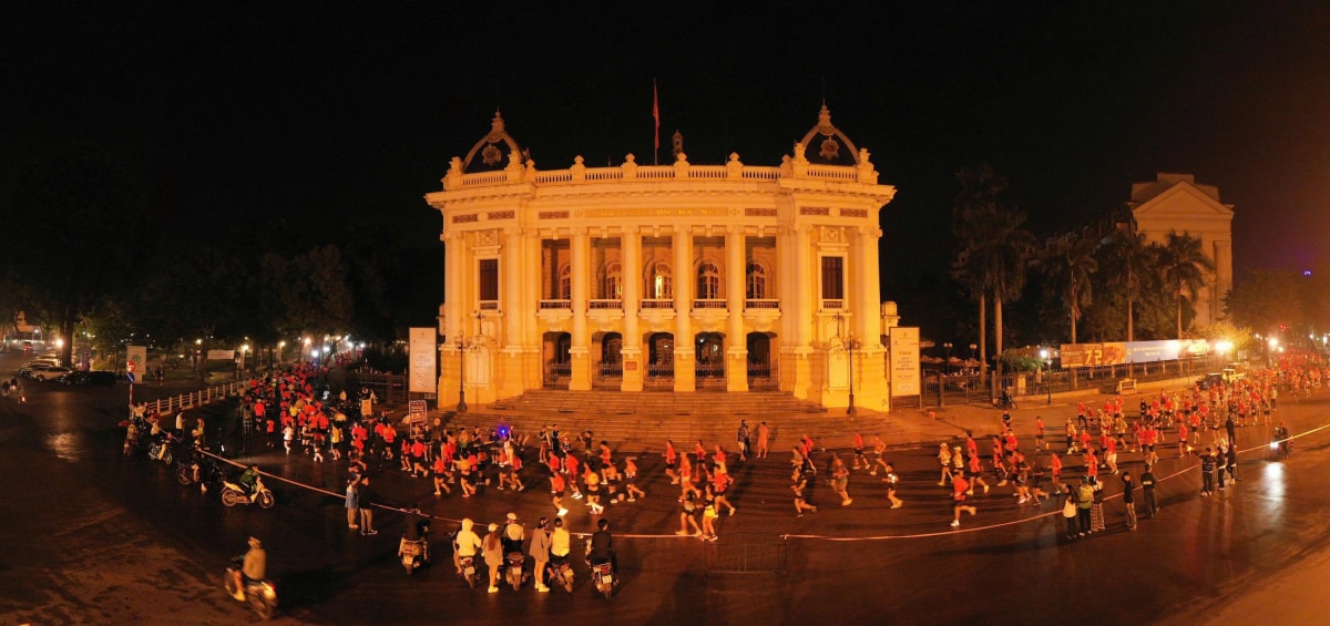 Cung đường VnExpress Marathon Hanoi Midnight đưa runner qua Lăng Bác, hồ Gươm, Nhà hát Lớn... trong không gian đêm tĩnh lặng, tạo nên những khung hình độc đáo.
