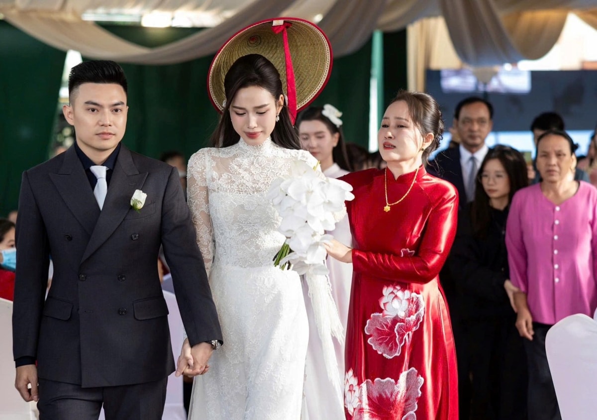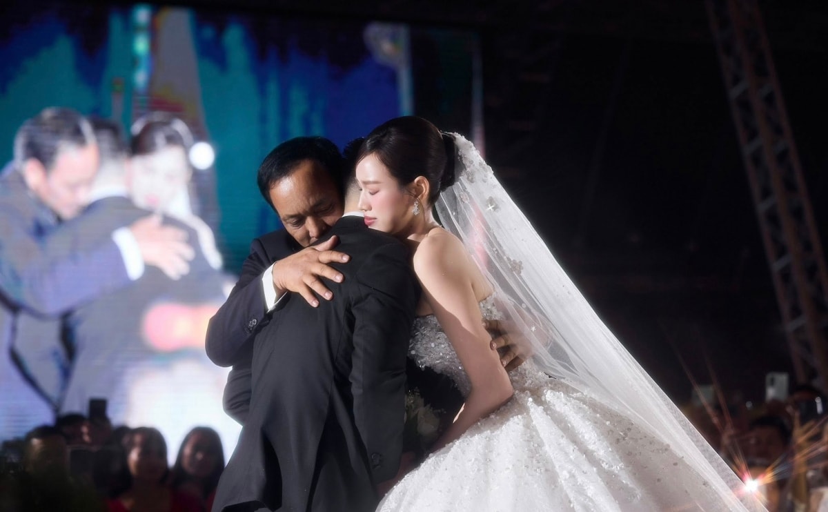 "Hôm nay, đám cưới các con được tổ chức nơi giao giữa hai con sông Nhật Lệ và Long Đại. Hai con sông ấy cùng nhau ra biển lớn, không thể tách rời. Cha chúc các con hạnh phúc, quấn quýt như hai dòng sông ấy", bố chồng Đỗ Hà nói.