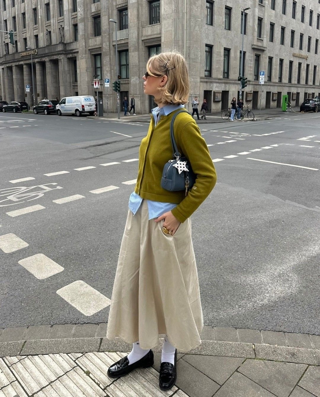 Kết hợp giày Mary Jane đế bằng cùng váy len và áo khoác tối giản là một trong những cách dễ áp dụng và hiệu quả.