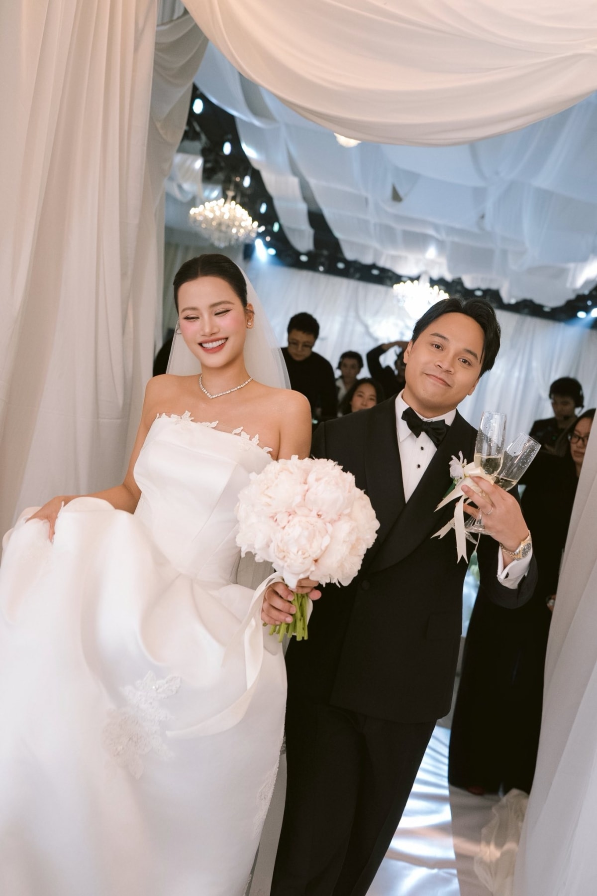 Đám cưới của con gái doanh nhân Johnathan Hạnh Nguyễn và cựu diễn viên Thủy Tiên là sự kiện hot cuối năm. Fashionista Tiên Nguyễn và chồng người Dubai đón hàng trăm khách mời showbiz dự hôn lễ ở TP HCM vào ngày 7/12, sau đó tổ chức thêm tiệc ở Đà Nẵng hôm 12/12. Họ đầu tư không gian lễ cưới xa hoa, theo kiến trúc Phục Hưng. Cô dâu diện nhiều mẫu váy cưới đắt tiền.