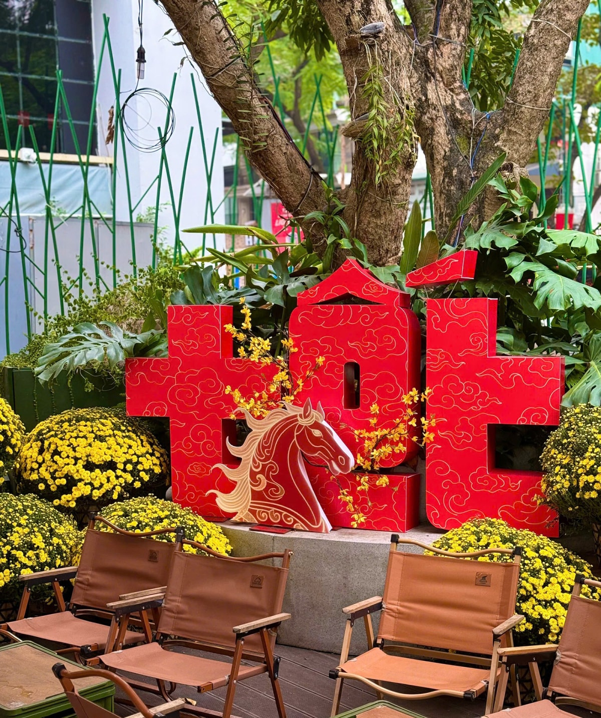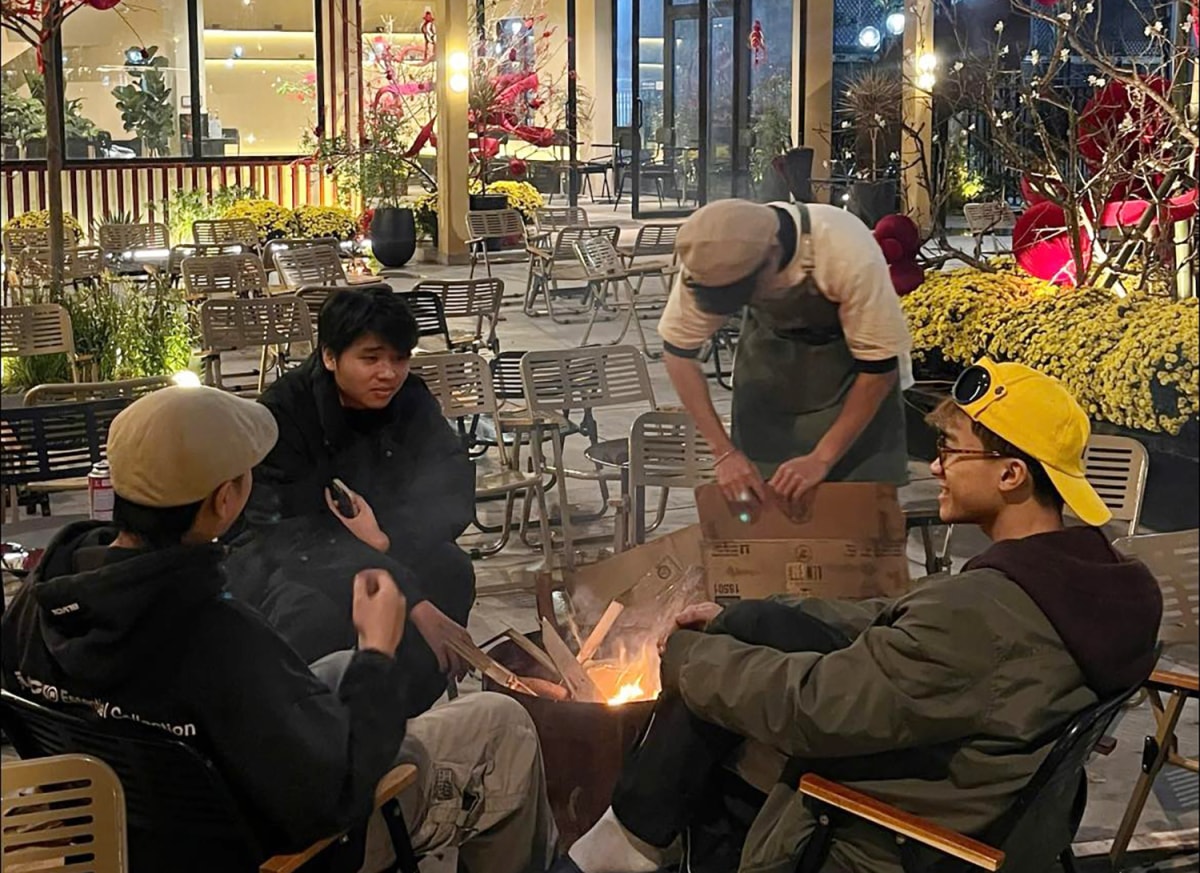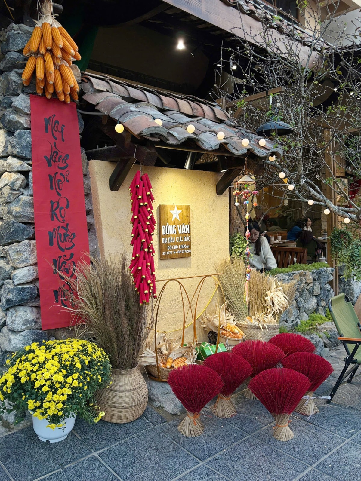 Quán có không gian Tết rực rỡ, đồ uống đa dạng, nhiều góc check in. Nếu thích màu đỏ và vàng, khách ghé quán ban ngày, còn buổi tối không gian trầm và ấm cúng hơn với bếp lửa, nơi các nhóm bạn bè quây quần tán chuyện ở khoảng sân chung.