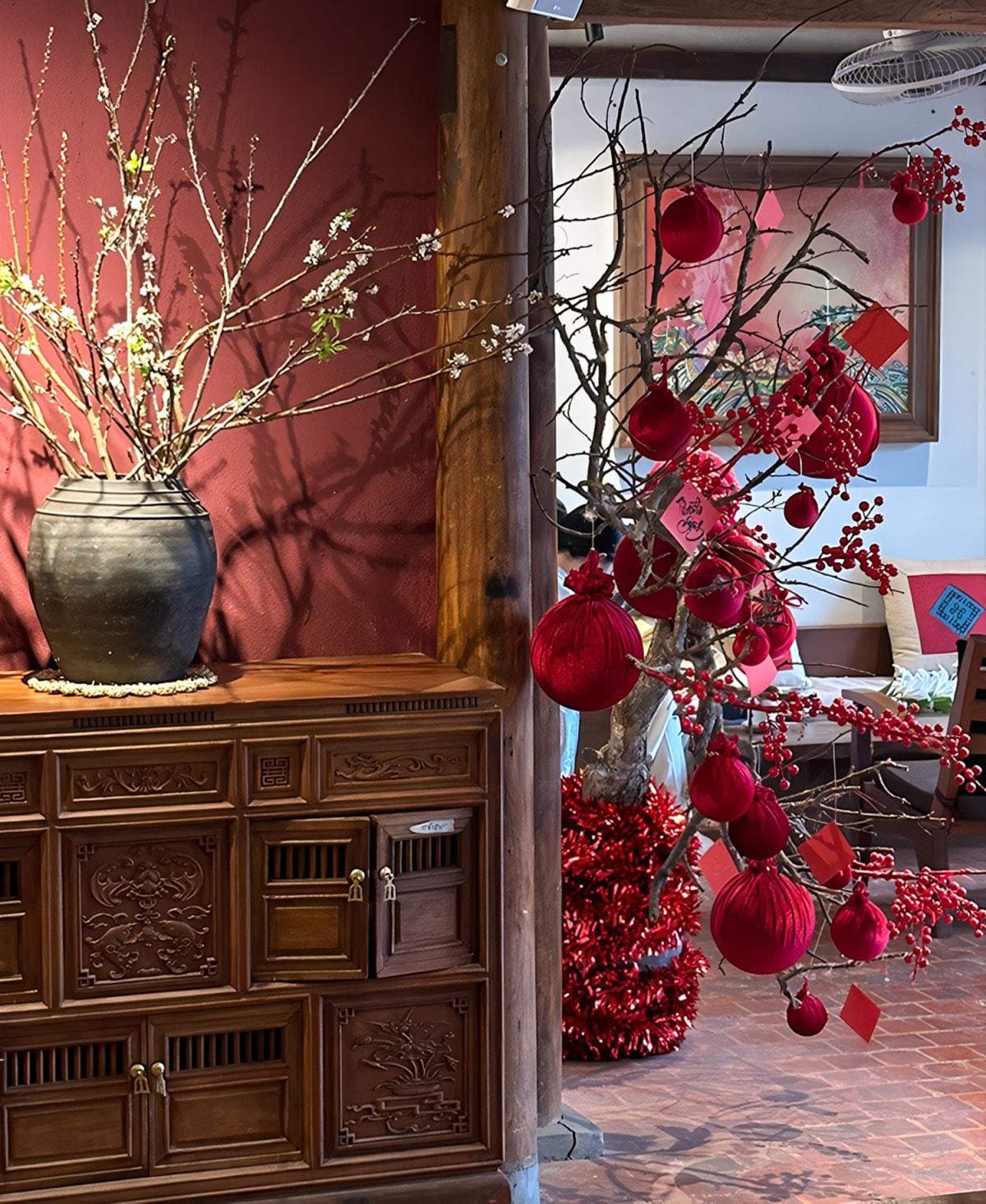 Quán trang trí Tết theo nhiều lớp với đa dạng góc chụp, giúp khách dễ dàng thay đổi bối cảnh. Sử dụng không gian chủ đạo từ gỗ và các vật liệu truyền thống như gốm, ngói, gạch đất nung, địa điểm này phù hợp cho việc chụp ảnh cùng áo dài hoặc trang phục dân tộc.