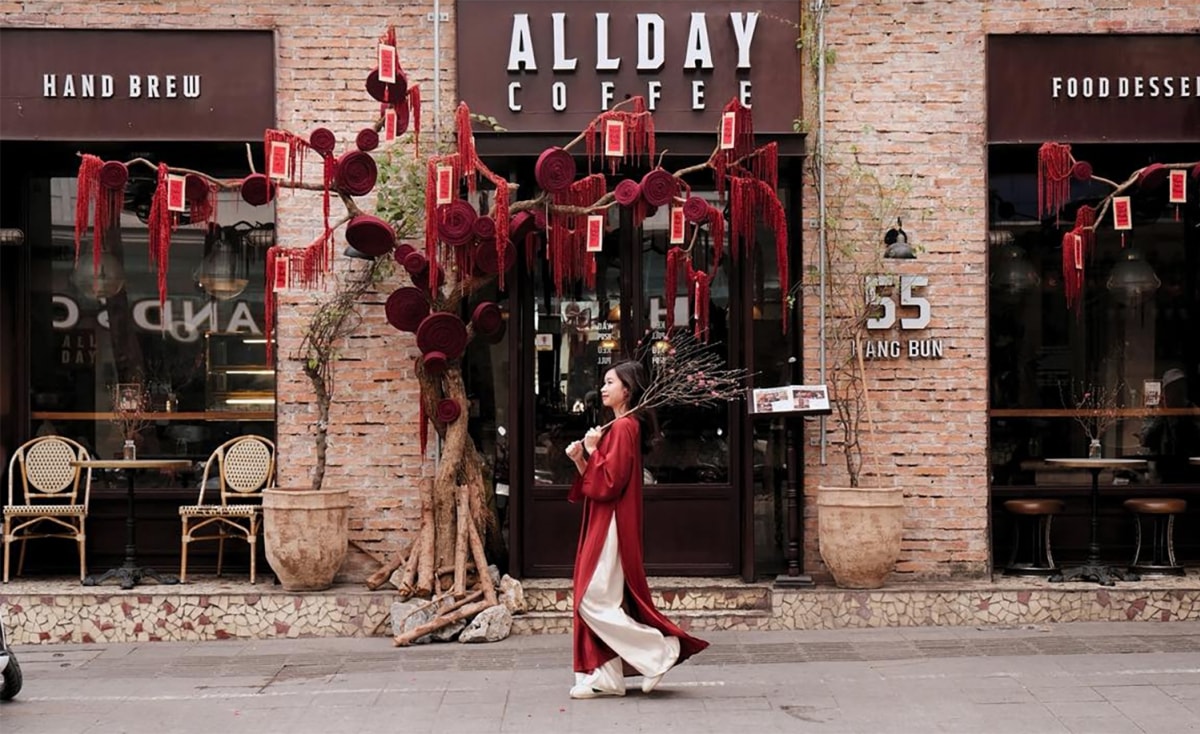 All Day dùng gam đỏ trầm quen thuộc làm màu chủ đạo cho không gian trang trí Tết. Hai cơ sở của quán đều mở xuyên Tết. Quán treo thêm những câu chúc đầu năm, gửi gắm lời mong ước bình an và khởi đầu thuận lành đến từng vị khách ghé thăm. Quán giữ nguyên thực đơn trong dịp Tết.