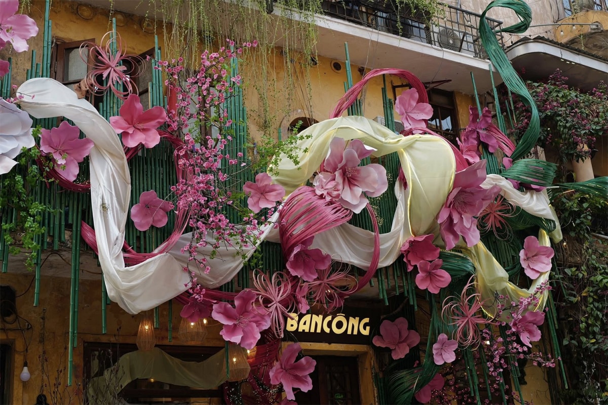 Ban Công gây ấn tượng với khách nhờ phong cách trang trí thay đổi theo từng mùa. Năm nay, quán chọn chủ đề "Bích Ngọ" cho không gian ngôi nhà cổ. Khu vực cổng vào được bày trí với lụa, hoa tạo bối cảnh cho khách chụp ảnh cùng áo dài hoặc các trang phục truyền thống. Quán mở cửa xuyên Tết, phục vụ đến 2h đêm giao thừa.