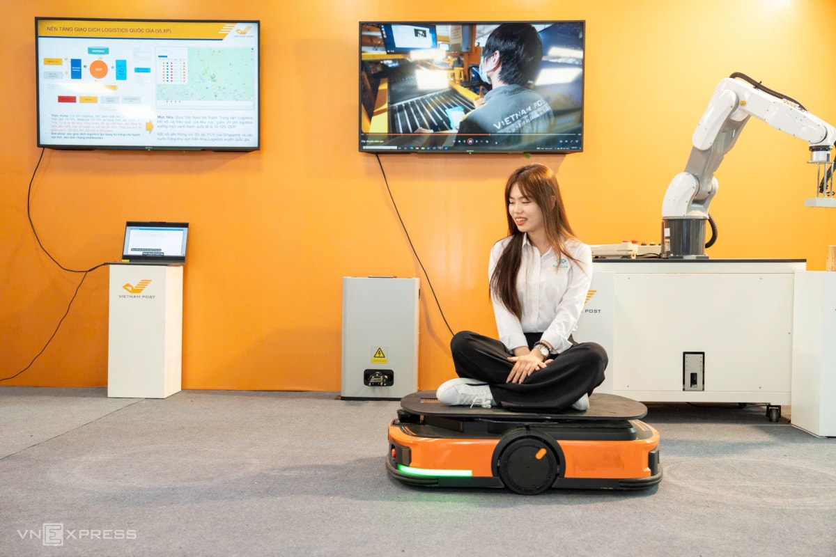 Tại gian hàng của Bưu điện Việt Nam, một số loại robot được dùng trong các kho hàng cũng được mang tới trình diễn. Trong hình là robot vận chuyển, cùng một cánh tay robot với độ chính xác cao, có khả năng vận chuyển, sắp xếp, phân loại hàng hóa trong kho.