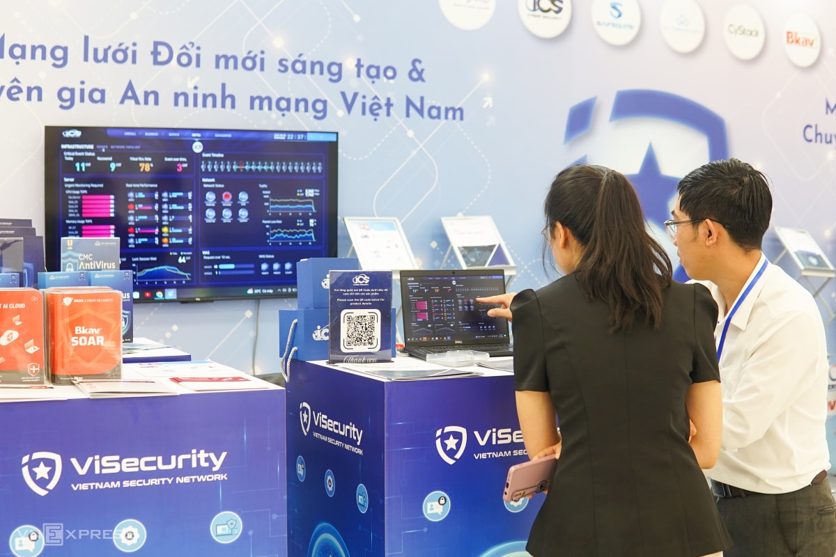 Tại gian hàng của Mạng lưới An ninh mạng, một trong những nhóm lĩnh vực được quan tâm hàng đầu hiện nay, nhiều giải pháp do kỹ sư Việt phát triển được trình diễn. Trong hình là hệ thống dashboard điều hành an ninh do công ty ICS Security thuộc mạng lưới phát triển, cho phép trực quan hóa trạng thái an ninh mạng theo thời gian thực, lãnh đạo cấp cao đưa ra các quyết định phản ứng nhanh.