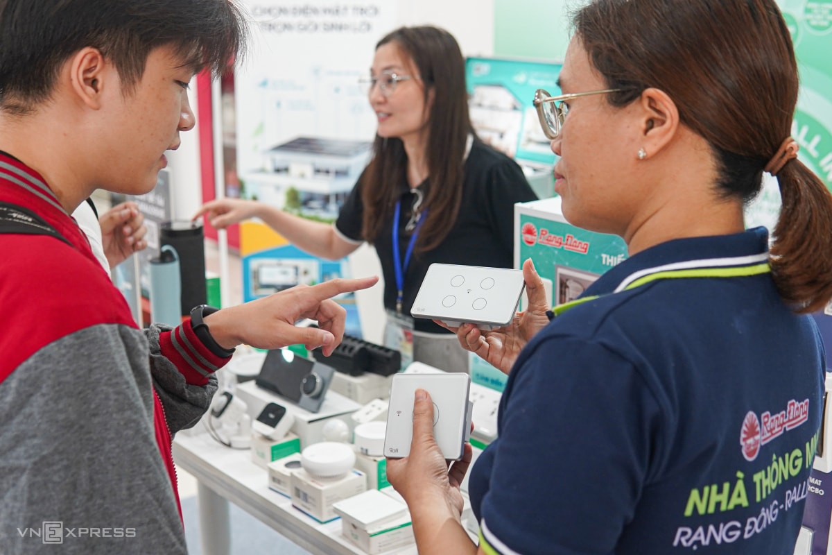 Nhóm bạn trẻ đang tìm hiểu tại gian hàng của Rạng Đông. Nổi tiếng với các thiết bị nhà thông minh, Rạng Đông năm nay mang tới triển lãm một số sản phẩm mới, được cải tiến về công nghệ kết nối, trong đó có bộ công tắc có thể điều khiển qua Bluetooth, giúp người dùng linh hoạt hơn trong việc lắp đặt.