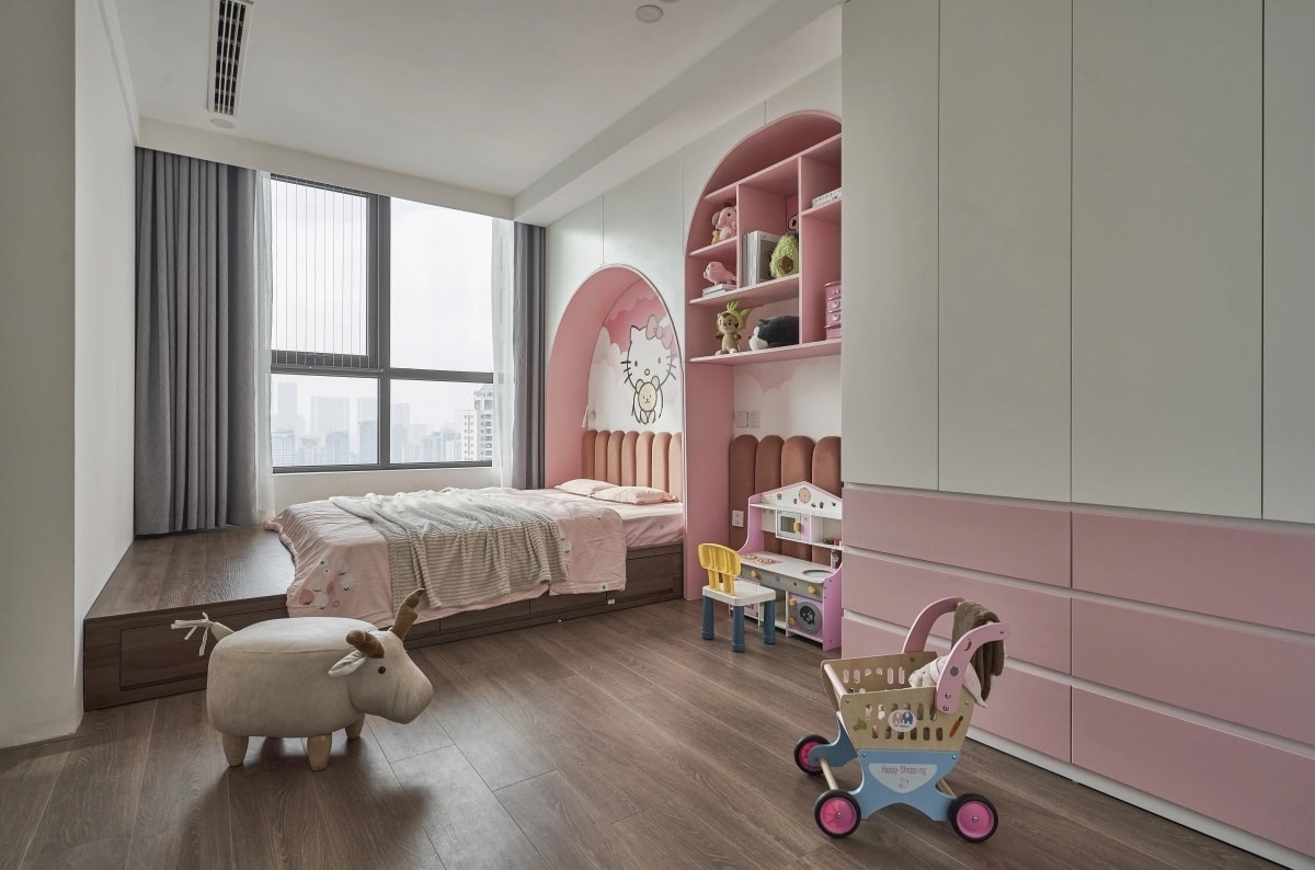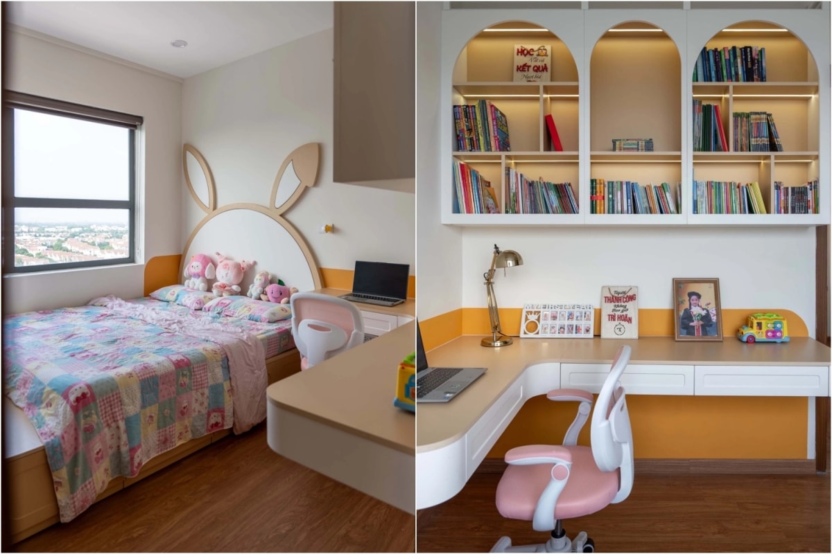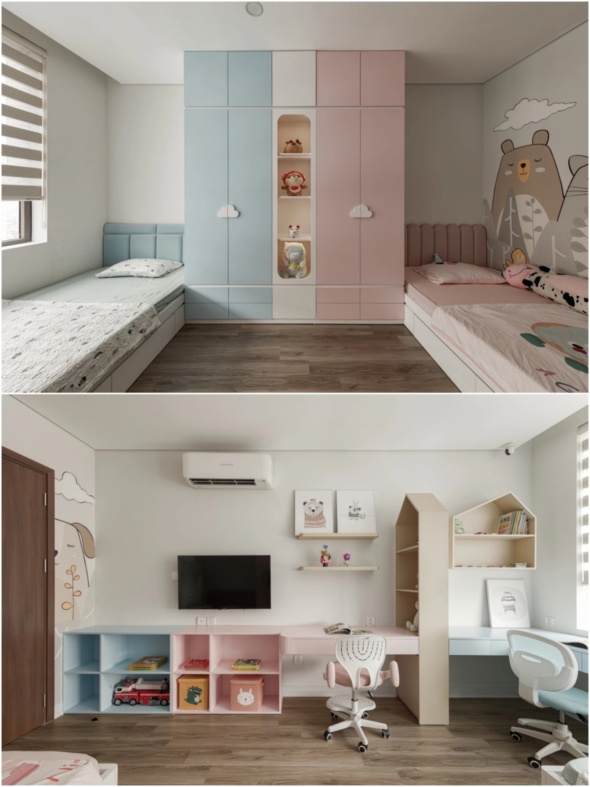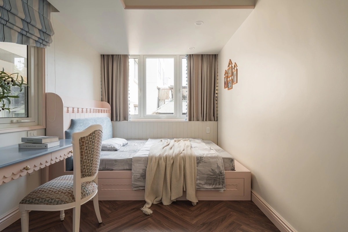 Trong khi đó, phòng bé gái mang sắc hồng nhạt, thiết kế giường kết hợp tủ kệ hình vòm bo cong nữ tính. Cả hai phòng đều có cửa sổ lớn và hệ thống lưới bảo vệ.