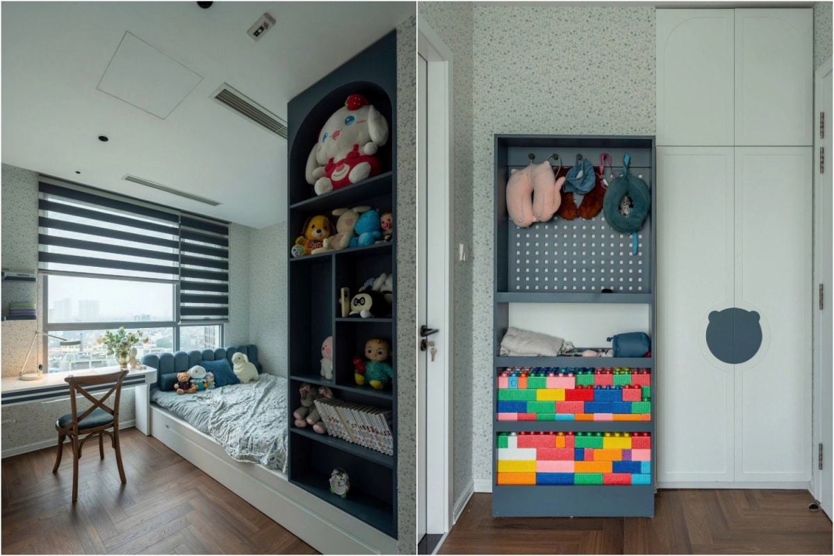 Bên cạnh giường là hệ kệ cao chạm trần, chia ô linh hoạt giúp bé có thể tự sắp xếp sách, thú nhồi bông hoặc đồ chơi. Một chi tiết nổi bật là tủ đồ chơi thiết kế riêng, với ngăn màu sắc rực rỡ mô phỏng khối LEGO, kích thích trí tưởng tượng của trẻ.