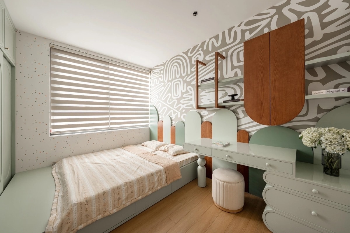 Phòng ngủ trẻ em trong ảnh có bảng màu kết hợp giữa xanh mint, cam gỗ và xám, tạo cảm giác tươi sáng. Hệ tủ và bàn học liền khối tích hợp nhiều ngăn chứa, thiết kế uốn lượn theo hình vòm cong, đồng bộ với họa tiết tường. Bàn học nối liền với kệ trưng bày, giá sách và hộc tủ, được bố trí gọn sát tường, giúp tối ưu diện tích sử dụng. Giường ngủ thấp, tích hợp ngăn kéo lưu trữ bên dưới. Tường đầu giường trang trí bằng các mảng bo tròn cao thấp xen kẽ.