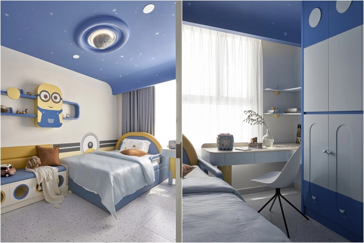 Bàn học đặt cạnh cửa sổ lớn, kết hợp giá sách gắn tường và hệ tủ cao phong cách hoạt hình. Mảng tường cạnh giường là hệ ghế băng tích hợp hộc lưu trữ. Kệ treo hình nhân vật hoạt hình Minion đóng vai trò trang trí giúp căn phòng sinh động.