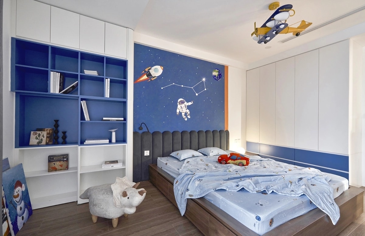 Các KTS của BA Design đã thiết kế phòng ngủ bé trai nổi bật với chủ đề vũ trụ, sử dụng màu xanh đậm kết hợp tường trang trí hình phi hành gia và các hành tinh. Giường gỗ thấp cùng hệ tủ sách lớn giúp bé dễ dàng sắp xếp đồ dùng và sách vở.