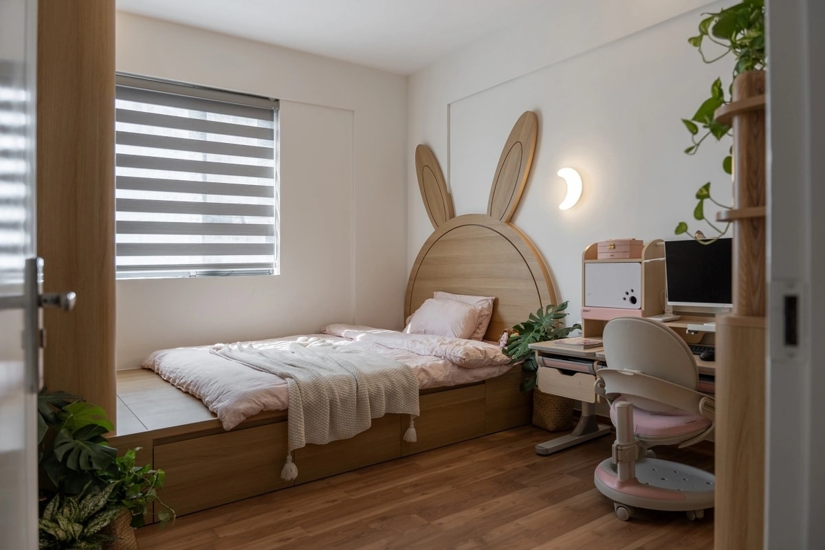 Phòng ngủ bé gái gây ấn tượng nhờ chiếc giường gỗ tích hợp hộc kéo tiện lợi, nổi bật với phần đầu giường hình tròn và đôi tai thỏ ngộ nghĩnh. Bàn học đặt cạnh giường với thiết kế gọn gàng, đi kèm ghế ngồi điều chỉnh được độ cao, giúp bé học tập thoải mái và an toàn.