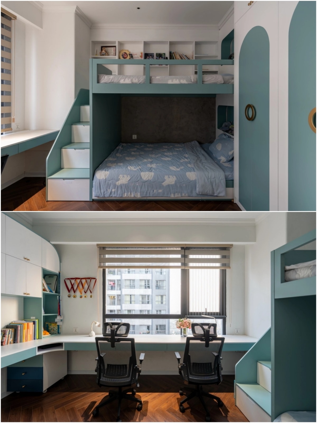 Căn hộ rộng 270 m2 tại Hà Nội được cải tạo từ hai căn hộ liền kề, là tổ ấm của một gia đình ba thế hệ. Phòng ngủ dành cho hai bé được KTS của Vietdeco thiết kế hiện đại với giường tầng. Đây là giải pháp tối ưu để tiết kiệm diện tích mà vẫn đảm bảo mỗi bé có không gian nghỉ ngơi riêng tư. Cầu thang lên tầng trên tích hợp ngăn kéo chứa đồ, giúp tăng diện tích lưu trữ mà không chiếm thêm diện tích sàn.