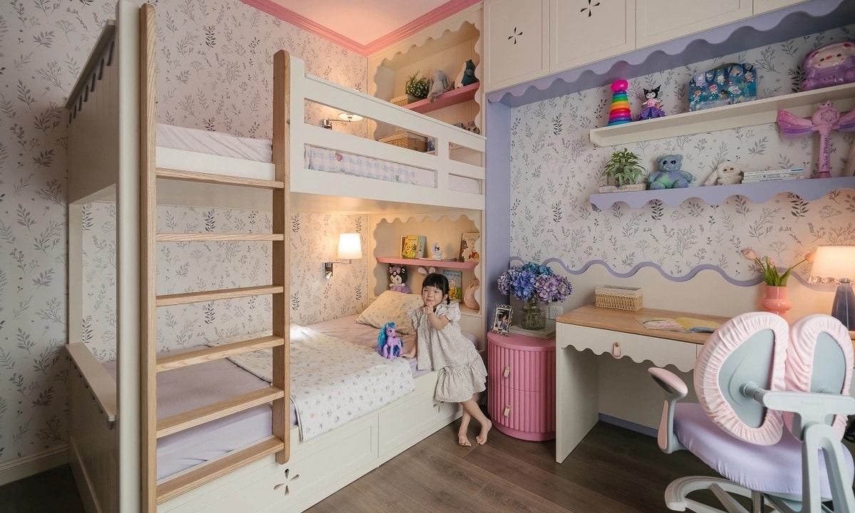 Mousson Design thiết kế căn phòng lấy cảm hứng từ chính mong muốn của bé, phối hợp giữa hai gam màu tím lilac và hồng pastel. Họa tiết uốn cong xuất hiện xuyên suốt ở đầu giường, mép tủ, kệ và bàn học, mang lại cảm giác nhẹ nhàng và an toàn. Giường tầng là điểm nhấn chính, tích hợp ngăn kéo lưu trữ đồ chơi, sách vở, đồng thời tạo thêm không gian cho bé vui chơi, khám phá.