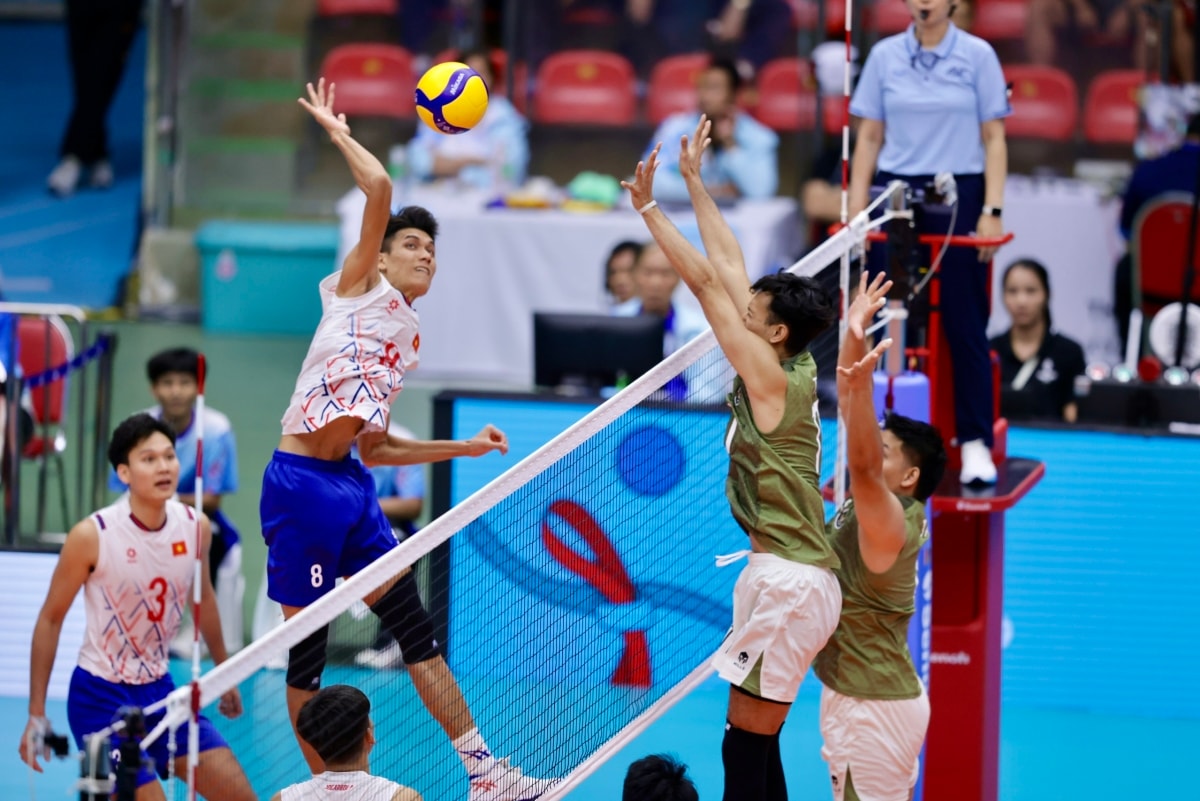 Ở trận bán kết bóng chuyền nam với "gã khổng lồ" khu vực là Indonesia, Việt Nam chơi quả cảm và mạnh mẽ để bất ngờ thắng hai set đầu 25-21 và 25-20.