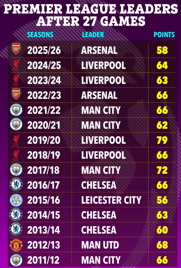 Sau 27 vòng, Arsenal là đội đầu bảng có số điểm thấp nhất trong một thập kỷ tại Ngoại hạng Anh. Trong 15 mùa gần nhất, chỉ có Leicester City mùa 2015-2016 giành ít hơn 60 điểm (56 điểm) sau 27 trận mà vẫn dẫn đầu. Khi đó, Leicester hưởng lợi từ việc các "ông lớn" sa sút đồng loạt để tạo nên câu chuyện cổ tích - vô địch với tỷ lệ cược 5.000-1.