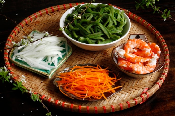 Chuẩn bị các nguyên liệu khác: Tôm rút chỉ đen ở lưng rửa sạch, đun sôi nồi nước thêm nhánh gừng và chút đường rồi thả tôm vào luộc. Khi tôm vừa chín tới, uốn mình lại giống nửa hình bán nguyệt, vỏ chuyển màu đỏ cam là được. Không luộc tôm lâu quá, uốn cong đầu chạm đuôi sẽ khô bở, mất đi độ giòn ngọt. Vớt ra để nguội, bóc vỏ rồi dùng dao mỏng lạng mỗi con tôm làm đôi. Cà rốt cắt hình que chân hương hoặc bào sợi ngâm nước đá. Hành tây cắt lát mỏng, ngâm nước đá khử mùi và tăng độ giòn ngọt.