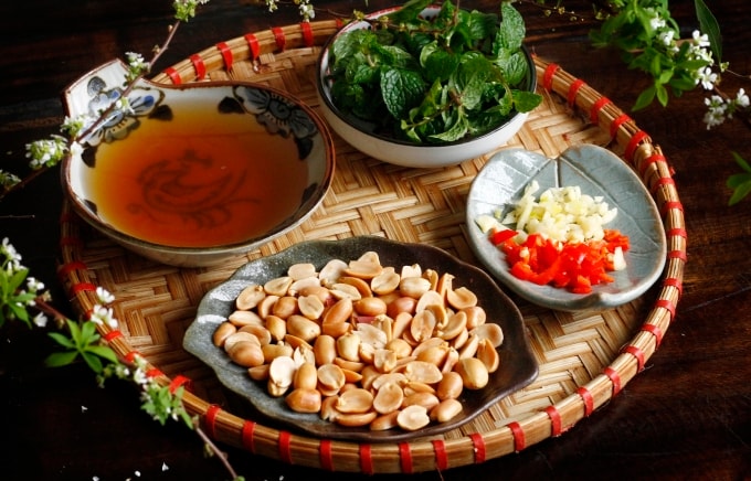 Chuẩn bị sốt trộn nộm: Pha hỗn hợp sốt trộn nộm gồm 40 gr đường, 30gr giấm, 30 gr mắm 30 độ đạm, 1/2 thìa cà phê muối hạt, 1/2 quả chanh. Khuấy đều cho hỗn hợp tan đều. Nêm nếm lại vị chua ngọt mặn sao cho hài hòa. Rau thơm rửa sạch, thái rối. Tỏi, ớt băm nhỏ.