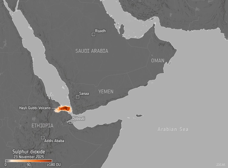 Núi lửa Hayli Gubbi vùng Afar phun trào sau thời gian dài ngủ yên, tạo ra đám mây tro bụi và khói bay về phía đông bắc qua Biển Đỏ.