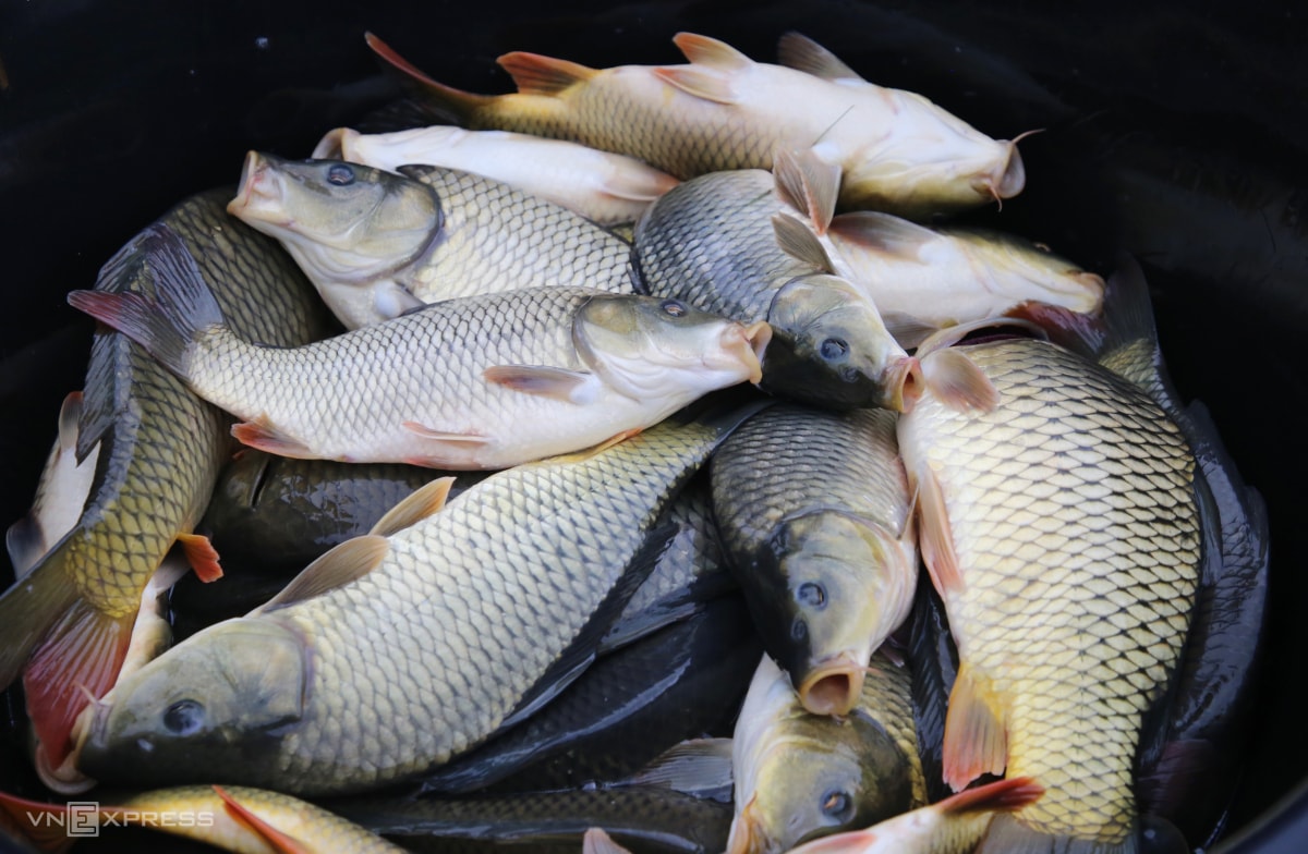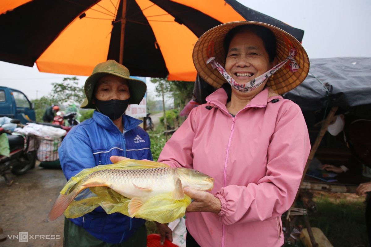 Bà Lê Thị Lý (bên phải) mua một con cá chép nặng 1,4 kg, giá hơn 80.000 đồng. "Cá sống trong môi trường tự nhiên, không ăn thức ăn công nghiệp nên thịt ngon", bà nói.